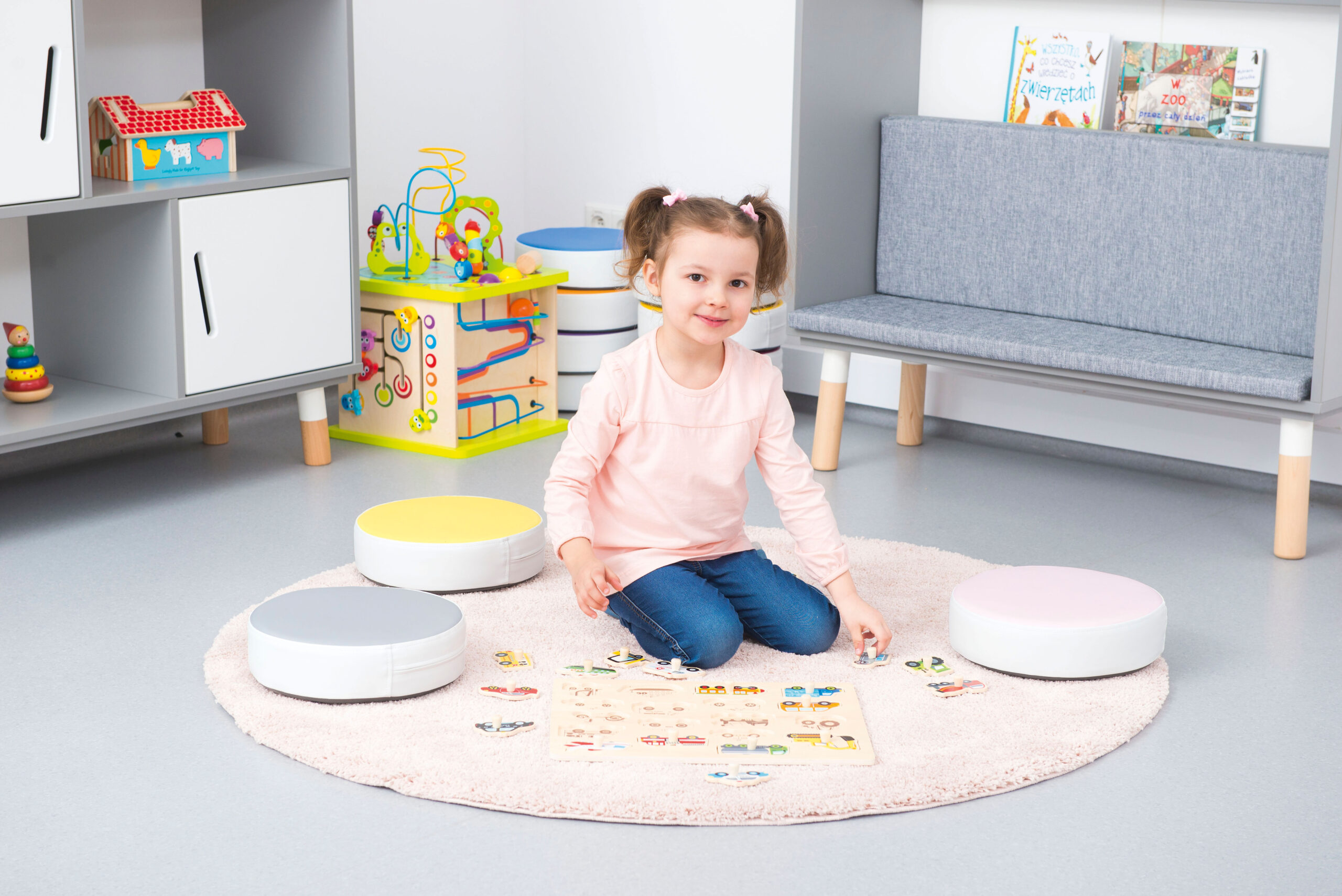 Apvalus pufas, kurio apačioje yra neslystantis paviršius, todėl kritimo ar paslydimo rizikos nėra. Pufo viduje yra tankios poliuretano putos, užtikrinančios minkštumą ir patogumą. Užvalkalas užsegamas užtrauktuku, todėl jį lengva uždėti arba nuimti.