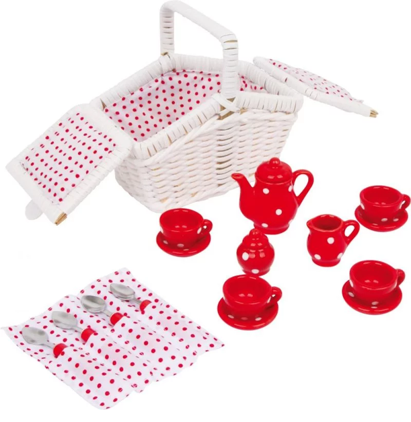 Mielas mini pikniko rinkinys sulankstomame krepšyje. Puodai, puodeliai, lėkštės, pieno ir cukraus indeliai iš keramikos ir keturi maži šaukšteliai glazūruotomis keraminėmis rankenėlėmis gražioje medžiaginėje servetėlėje. Meiliai kontrastingas taškuotas raštas.