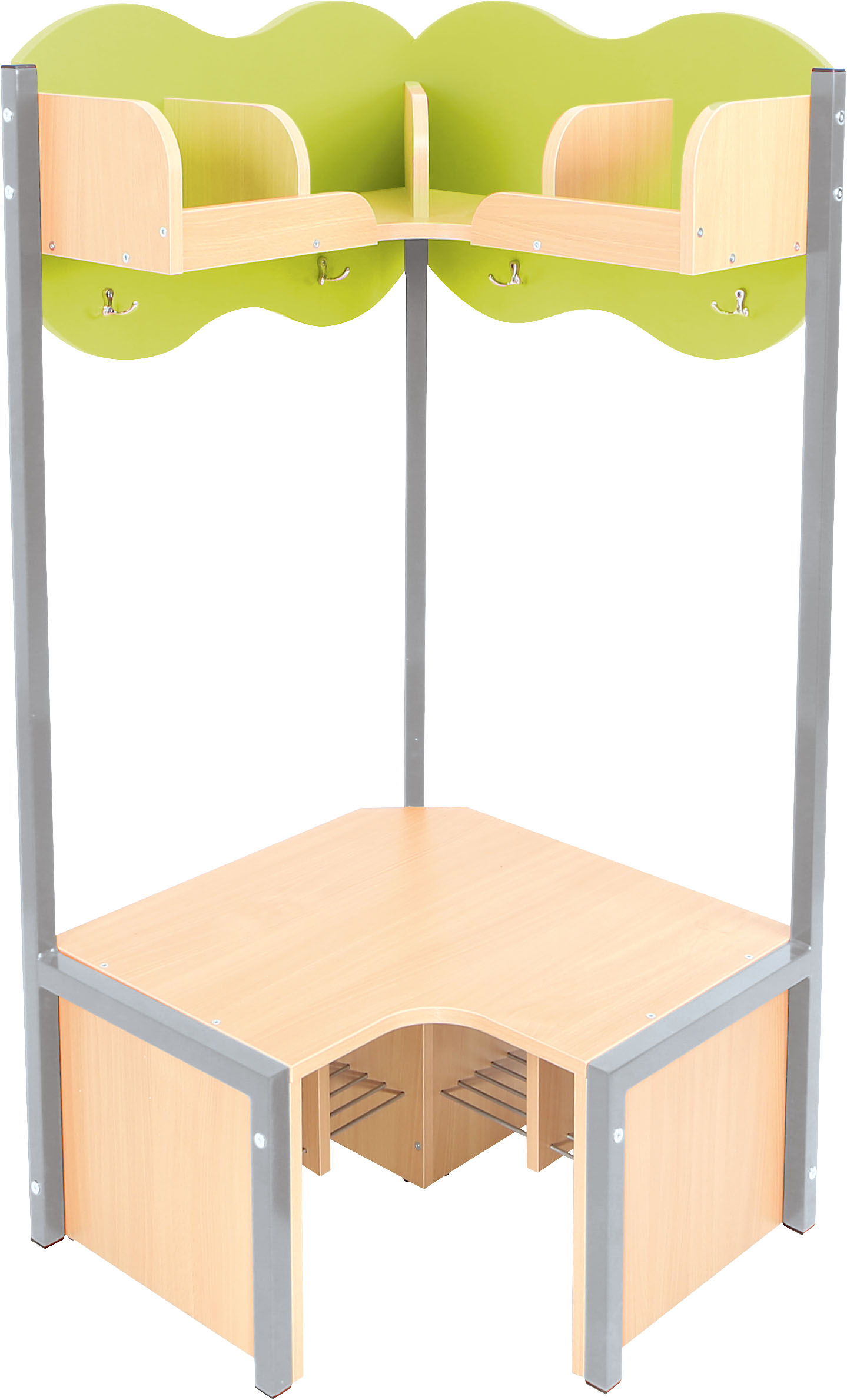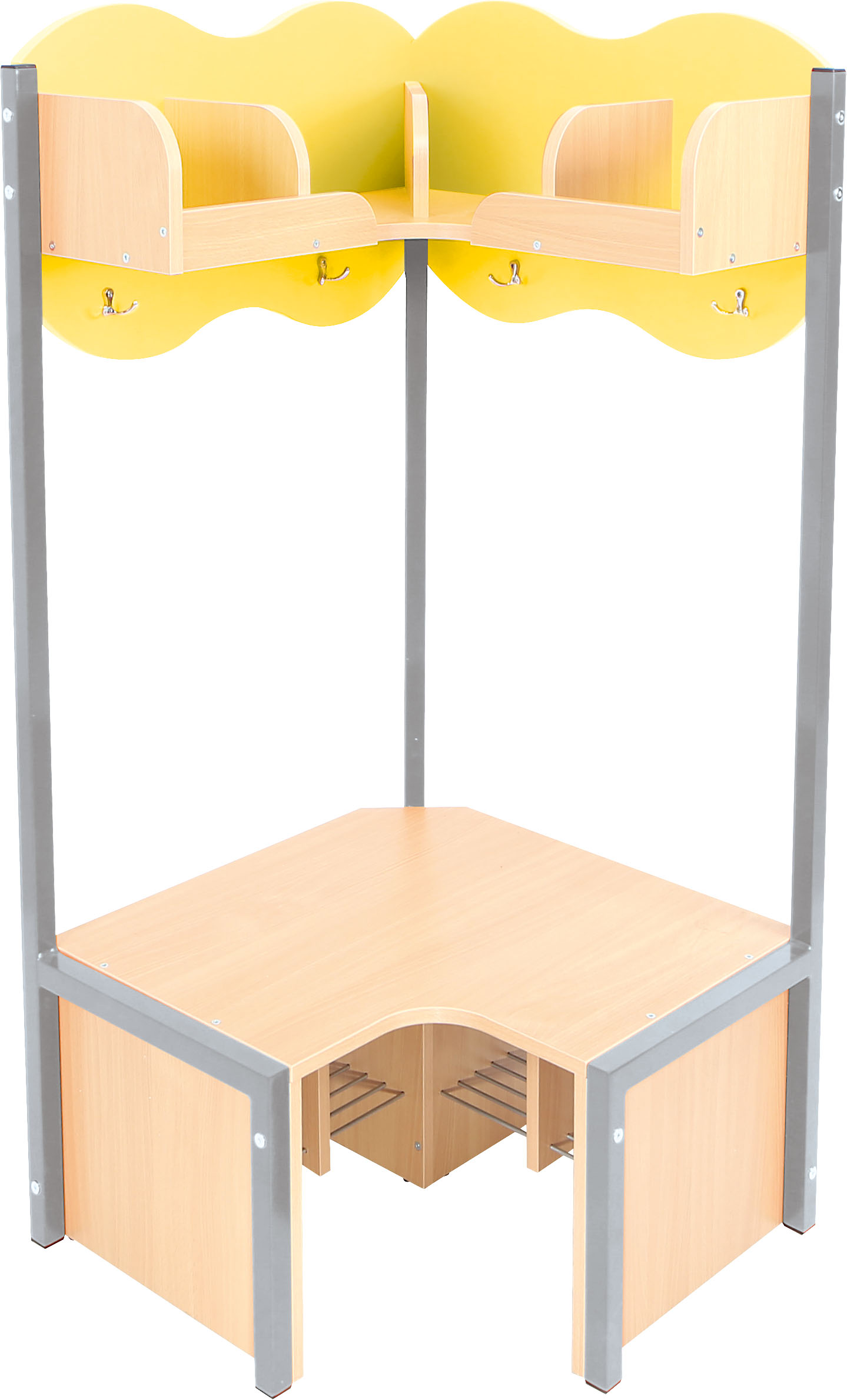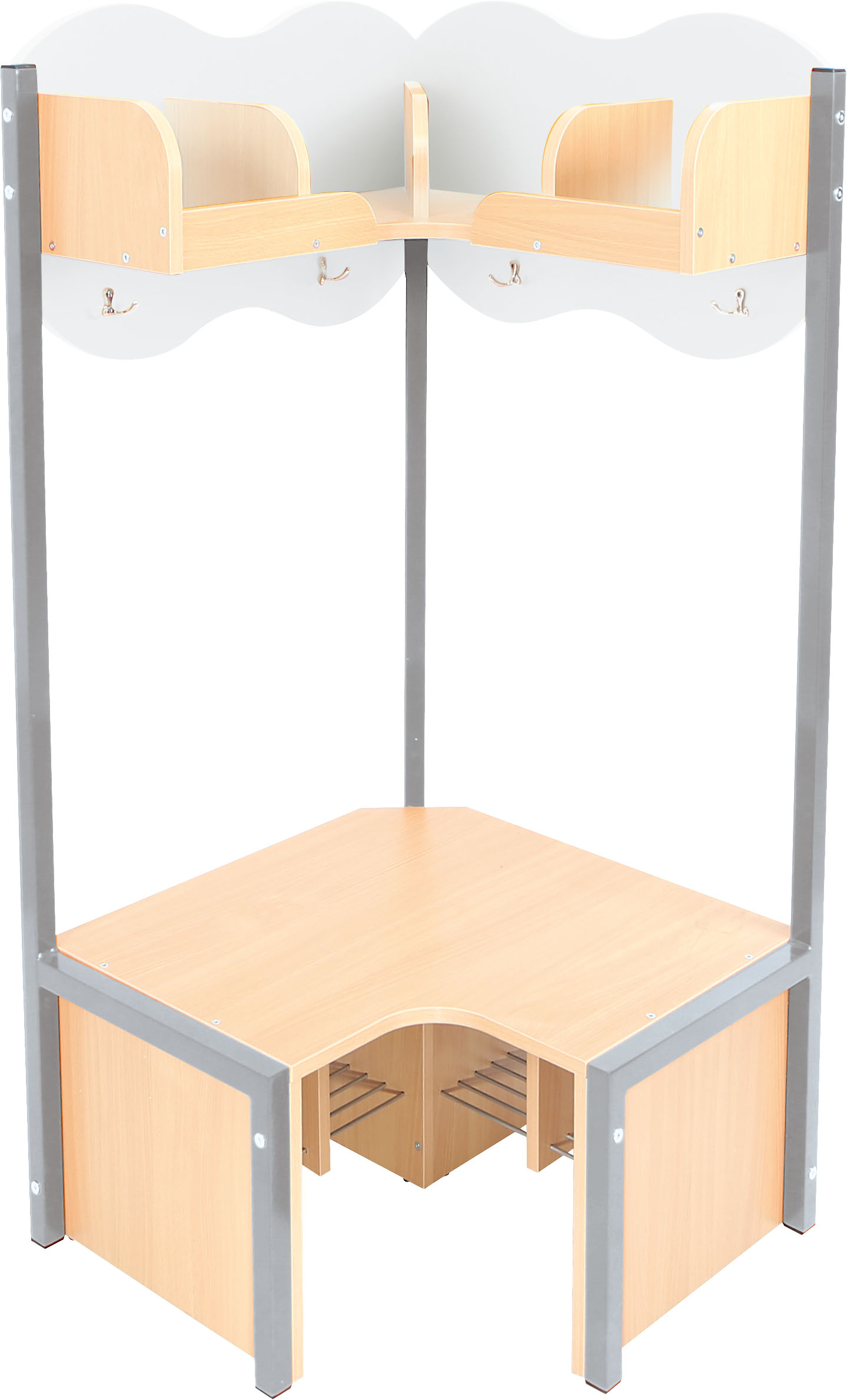 Lentyna su skyriais ir suoliukas pagaminti iš 18 mm storio laminuotos klevo atspalvio plokštės. Metalinės batų grotelės po suoliuku, kad apatinė drabužinės dalis išliktų švari.