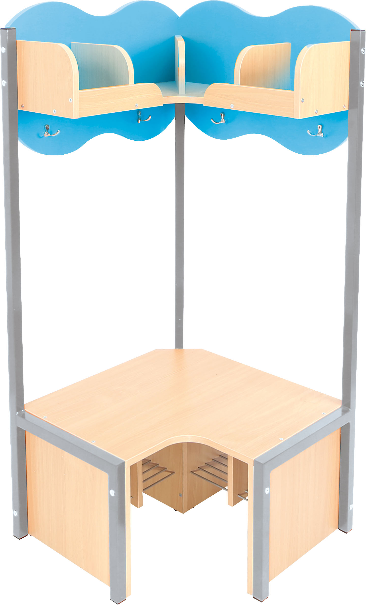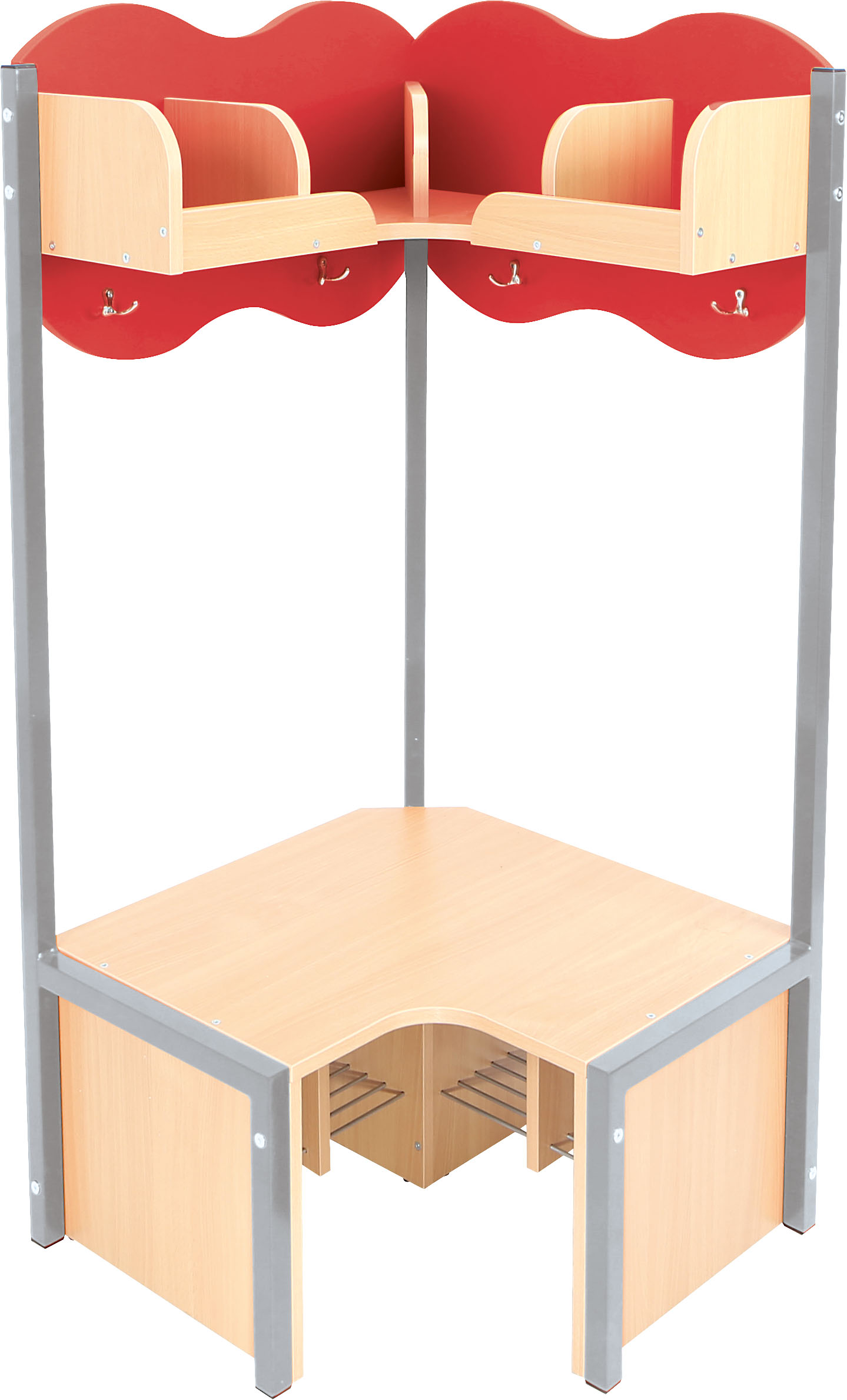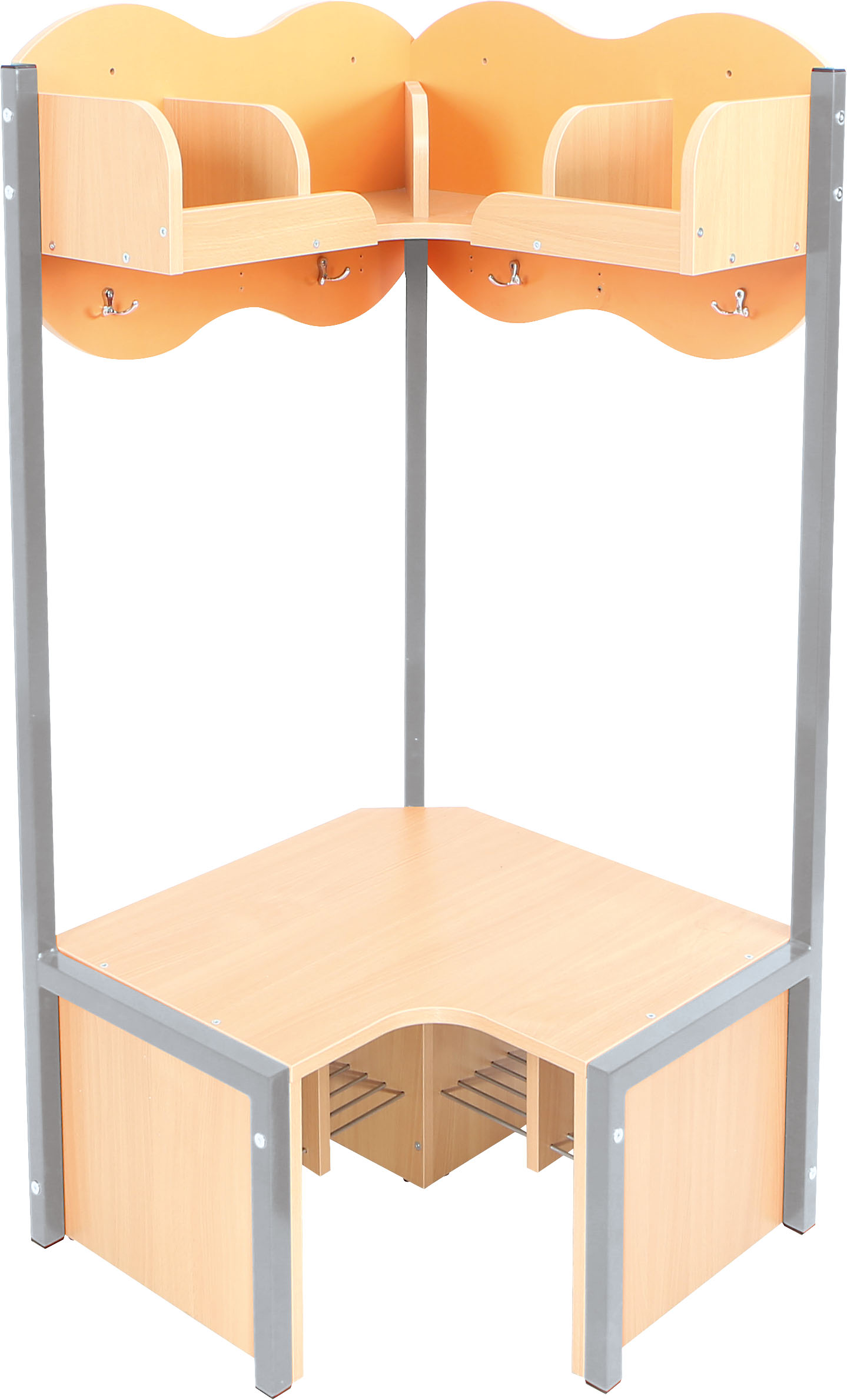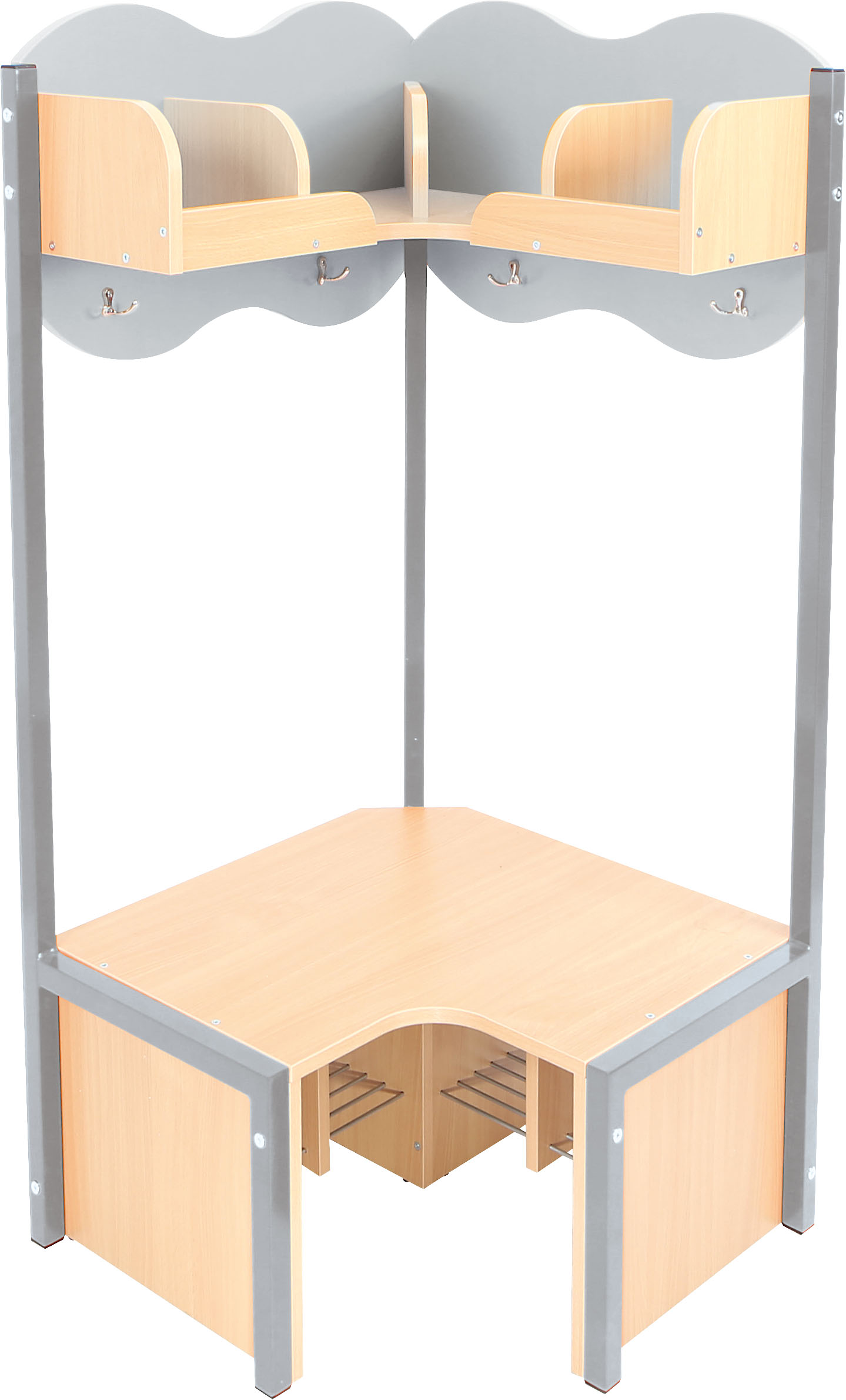 Lentyna su skyriais ir suoliukas pagaminti iš 18 mm storio laminuotos klevo atspalvio plokštės. Metalinės batų grotelės po suoliuku, kad apatinė drabužinės dalis išliktų švari.
