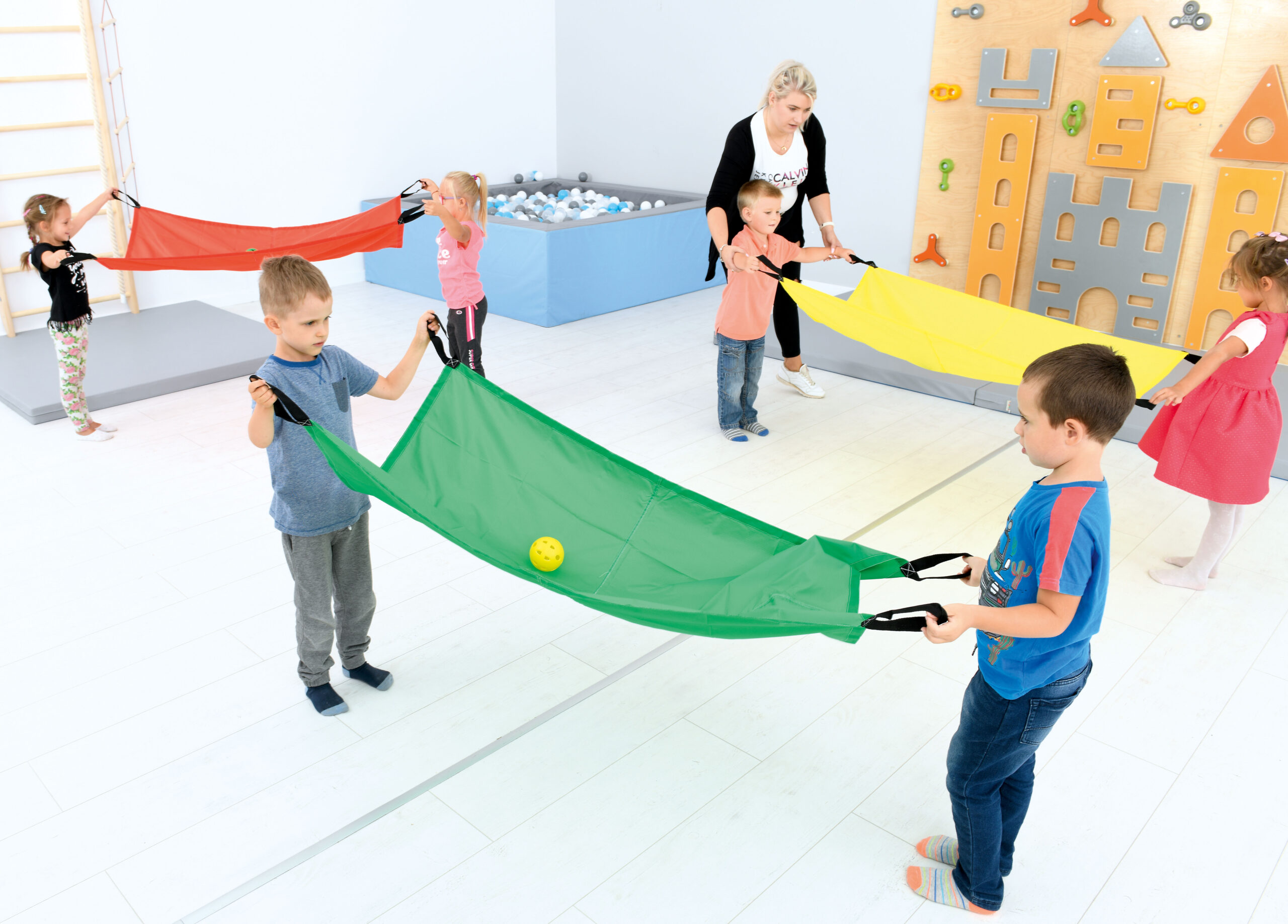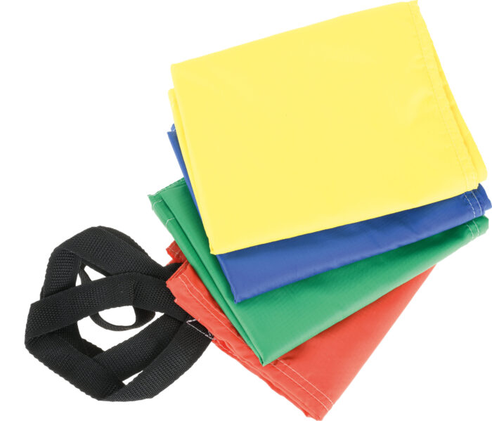4 spalvų rinkinys: geltonos, mėlynos, raudonos ir žalios. Su rankenėlėmis kampuose. Galima naudoti pratyboms poromis, pavyzdžiui, kamuolio mėtymui ir gaudymui, šokiams ir t. t.