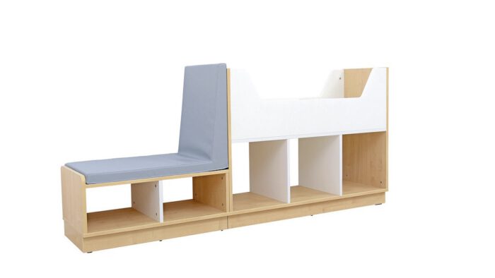 Bibliotekėlė su dviem pertvarom, žema spintelė su čiužinuku.