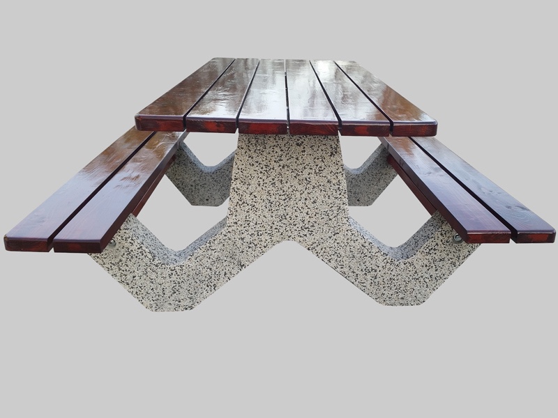 Betoninis-medinis poilsio (pikniko) stalas. Stalo pagrindas pagamintas iš natūralių užpildų. Stalviršis ir suoliukai pagaminti iš medžio, impregnuoti dviem sluoksniais lazūrinio lako ir dviem sluoksniais lako.