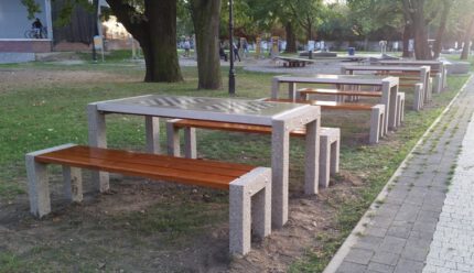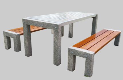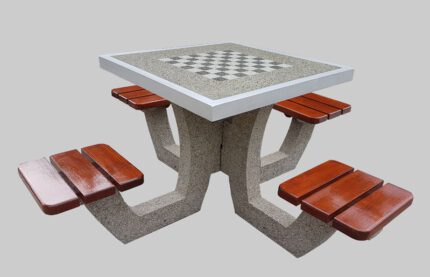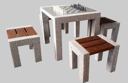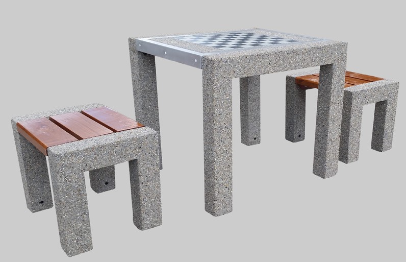 Stalo pagrindas pagamintas iš natūralių užpildų. Betoninis stalviršis su šachmatų / šaškių lenta, šlifuotas ir poliruotas, impregnuotas. Stalviršis yra padengtas aliuminio profiliu. Kėdutės pagamintos iš spygliuočių medienos, įmirkytos ir padengtos dviem lako sluoksniais.