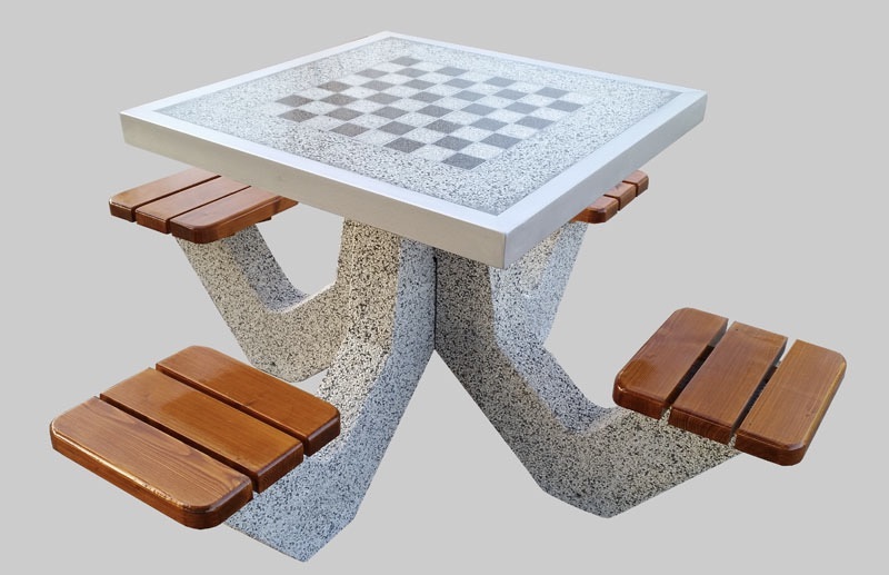 Betoninis stalas šachmatams / šaškėms. Stalas pagamintas iš natūralių užpildų. Stalviršį supa aliuminio profilis, kuris apsaugo stalo kraštus nuo smūgių. Stalviršio paviršius yra šlifuotas ir poliruotas bei apsaugotas laku. Sėdynės iš spygliuočių medienos.