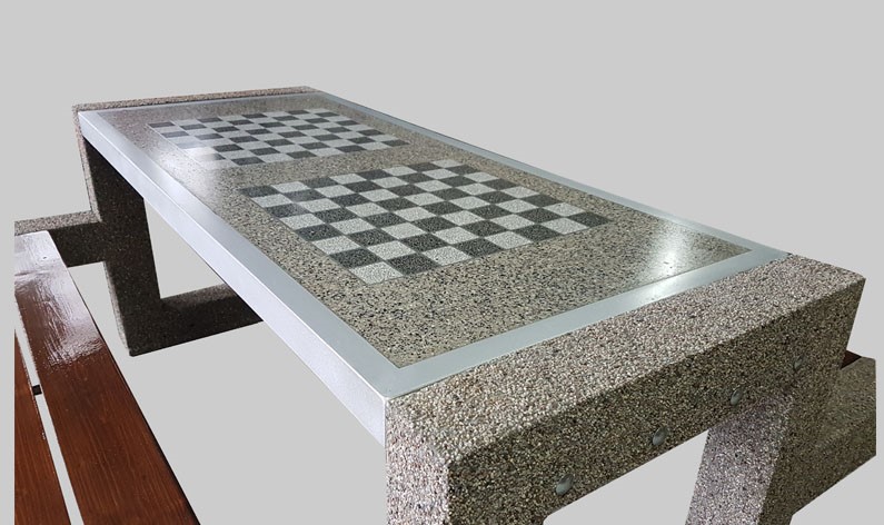 Žaidimų stalas su dviem lentomis ir dviem kombinuotais suolais. Betoninis ir medinis žaidimų stalas su dviem lentomis. Stalo pagrindas pagamintas iš natūralių užpildų. Betoninis stalviršis su dviem žaidimų lentomis, šlifuotas ir poliruotas, impregnuotas. Stalviršis yra padengtas aliuminio profiliu. Sėdynės pagamintos iš spygliuočių medienos, įmirkytos ir padengtos dviem lako sluoksniais. Stalas reikalauja tvirtinimo.