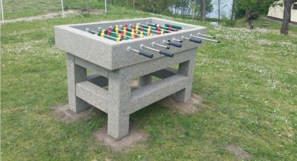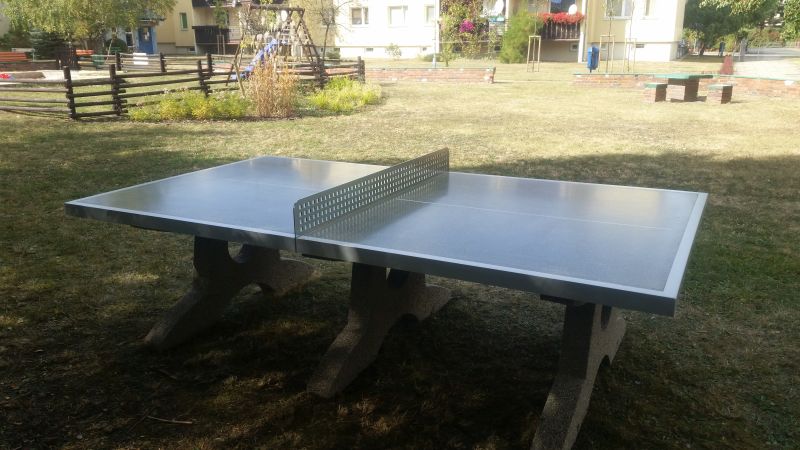 Betono teniso stalas. Stalas pagamintas iš natūralių užpildų. Pilką stalviršį supa aliuminio profilis, apsaugantis stalo kraštus nuo smūgio. Stalviršių paviršius yra šlifuotas, poliruotas ir apsaugotas laku. Tinklas pagamintas iš juodo cinkuoto plieno lakšto.