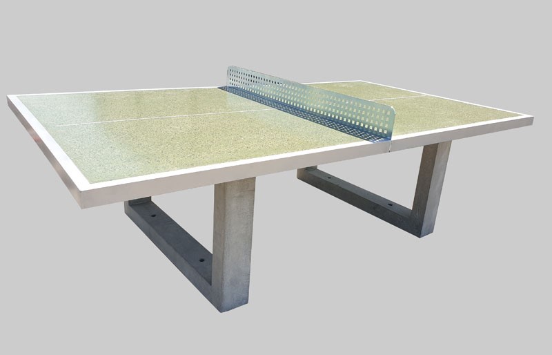 Betono teniso stalas. Stalas pagamintas iš natūralių užpildų. Pagrindas pagamintas iš architektūrinio betono. Žalią stalviršį supa aliuminio profilis, apsaugantis stalo kraštus nuo smūgio. Stalviršių paviršius yra šlifuotas, poliruotas ir apsaugotas laku. Tinklas pagamintas iš juodo cinkuoto plieno lakšto.