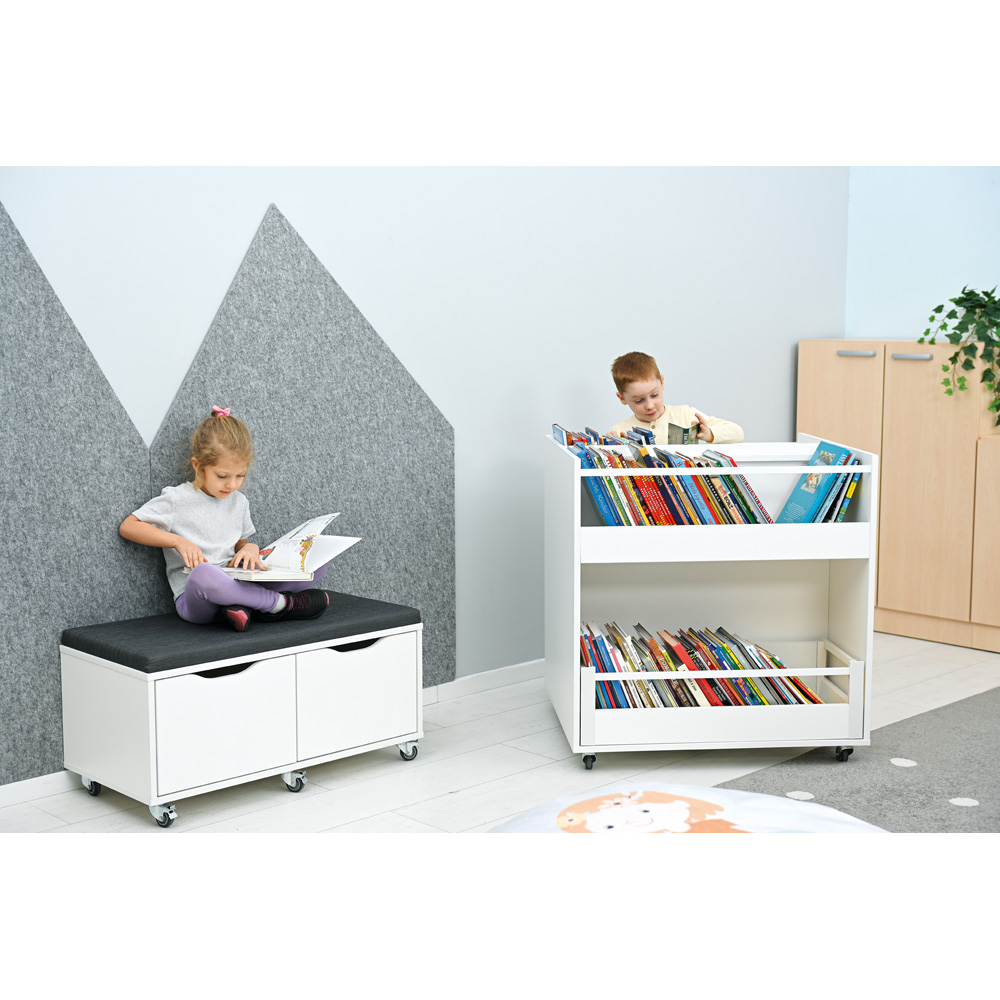 Tvirta knygų spinta su 2 skyriais viršuje ir 2 stalčiais apačioje, pasiekiamais iš abiejų spintos pusių. Puikiai tiks vaikų darželiams ir mokykloms. Suteikia daug vietos knygoms laikyti. Tvirti stalčiai sklandžiai slankioja ir turi tylaus prisilietimo mechanizmą. Pagaminta iš 18 mm storio laminuotos medžio drožlių plokštės klevo arba baltos spalvos su 2 mm storio ABS briaunomis. Stalčiaus dugnas pagamintas iš 16 mm storio laminuotos plokštės.