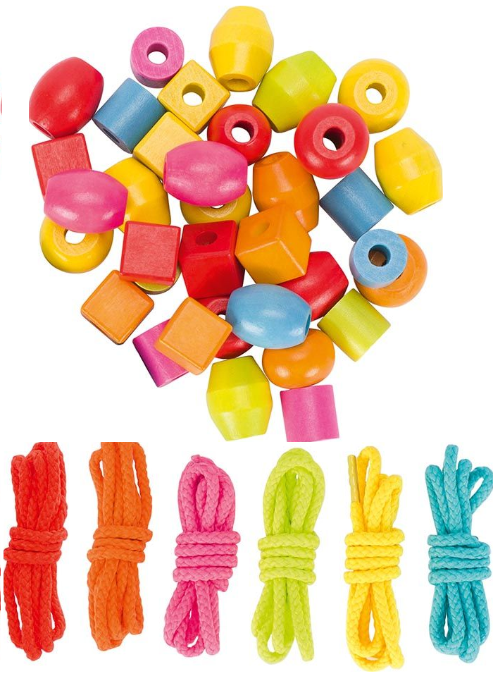 Kūrybinis rinkinys: 45 karoliukai, 5 skirtingų formų, ir 6 virvelės gali būti naudojami įvairiais būdais – vėriniams gaminti arba kaip pagalbinė skaičiavimo priemonė.