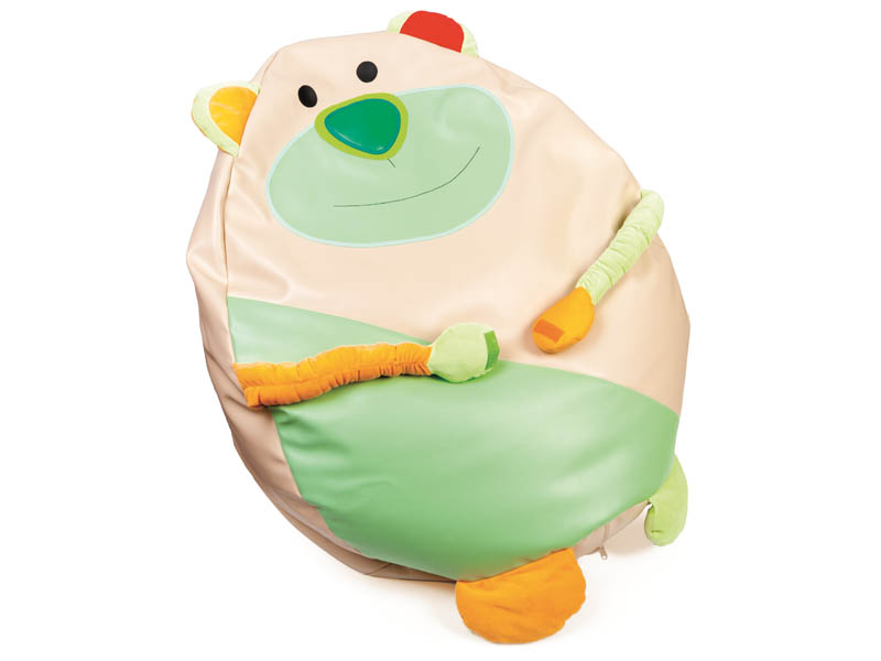 sensoriniai elementai: pomponas, varpelis, virvelė, sagos, skambutis; danga: trinčiai atsparus PVC audinys be ftalatų; užtrauktuku užsegamas dėklas užpildui.