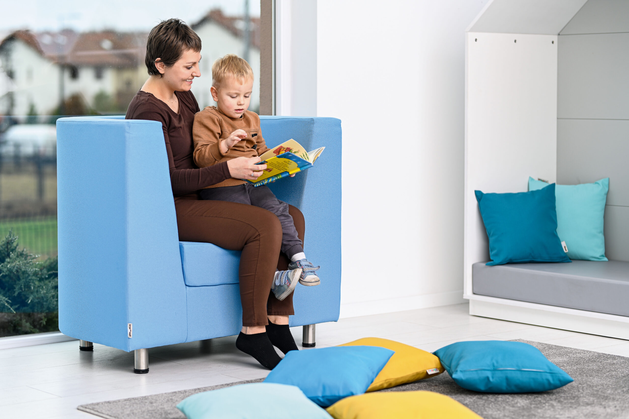 Fotelis aptrauktas minkštu nedegiu apmušalų audiniu. Medinė konstrukcija užtikrina stabilumą, o aukšti atlošai – patogumą. Ji puikiai tinka koridoriuje, skaitykloje ar poilsio zonoje.