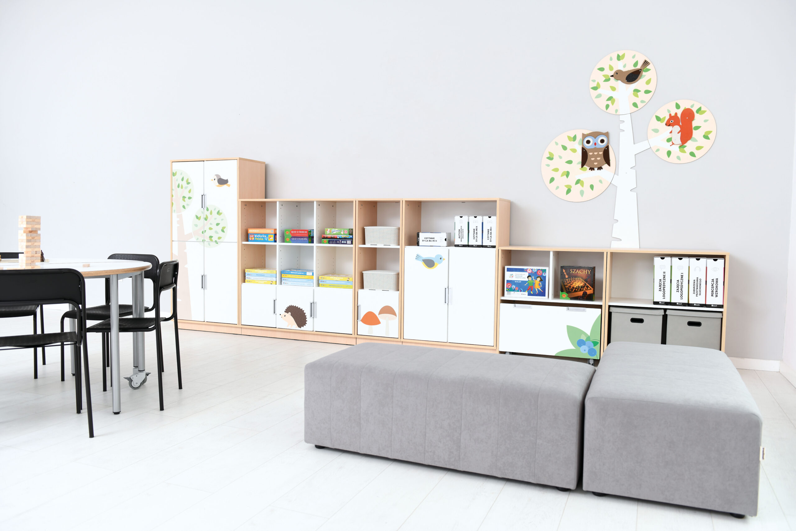Sėdimosios dalys pagamintos iš putplasčio ant medinio karkaso. Aptrauktos minkštu, maloniu liesti audiniu, užtikrinančiu komfortą ir estetišką išvaizdą. Puikiai tinka poilsio erdvėms, mokykloms ar vaikų kampeliams.