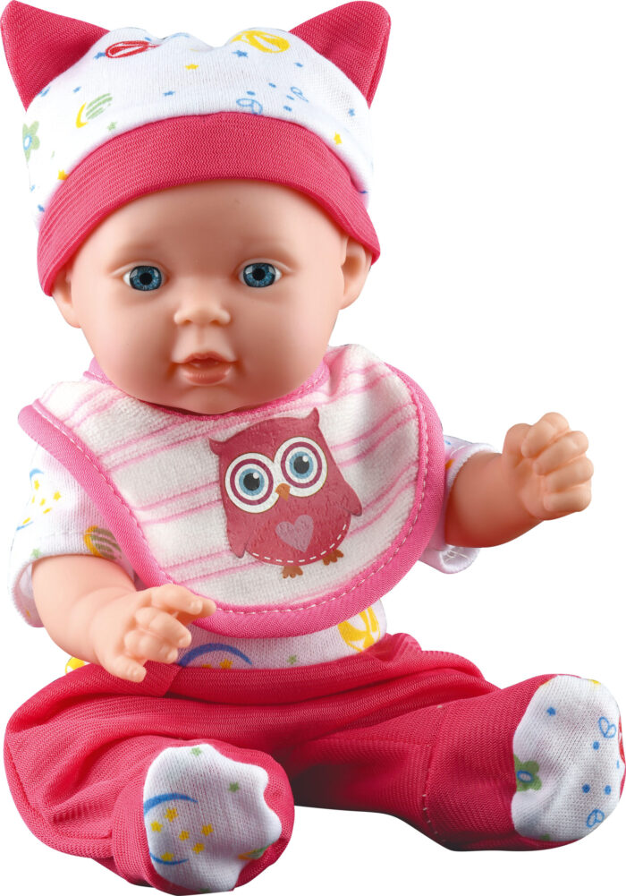 Kūdikio lėlė su minkštu liemeniu, plastikine galva, rankomis ir kojomis. Skleidžia 6 garsus.