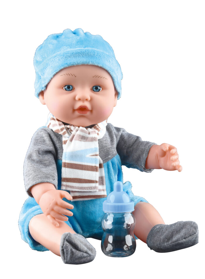 Kūdikio lėlė su minkštu liemeniu, plastikine galva, rankomis ir kojomis. Skleidžia 6 garsus.
