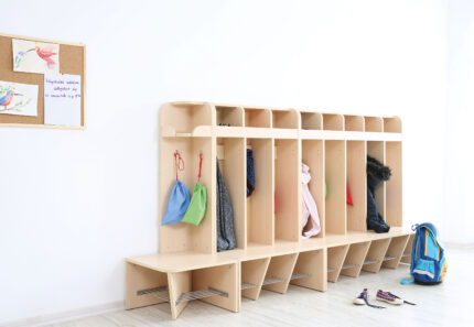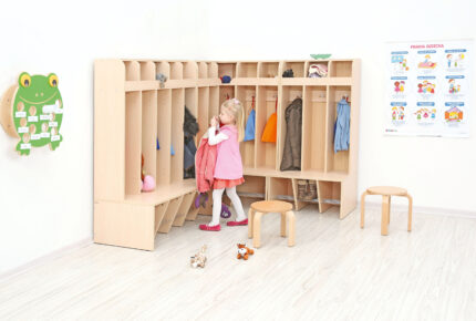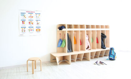 Durys pagamintos iš 12 mm storio laminuotos MDF plokštės. Matmenys pritaikyti prie Mariposa vaikų darželio rūbinės.