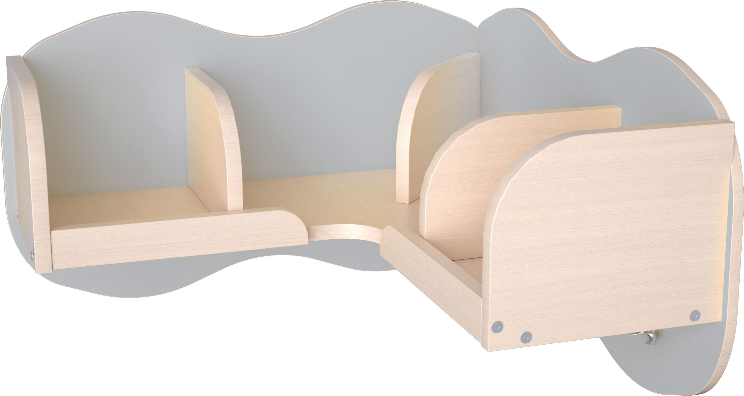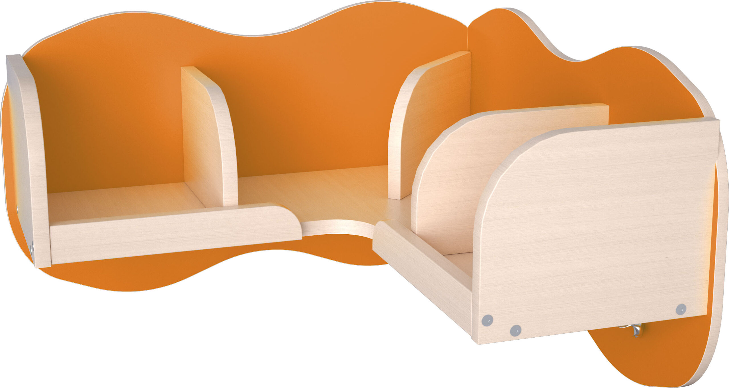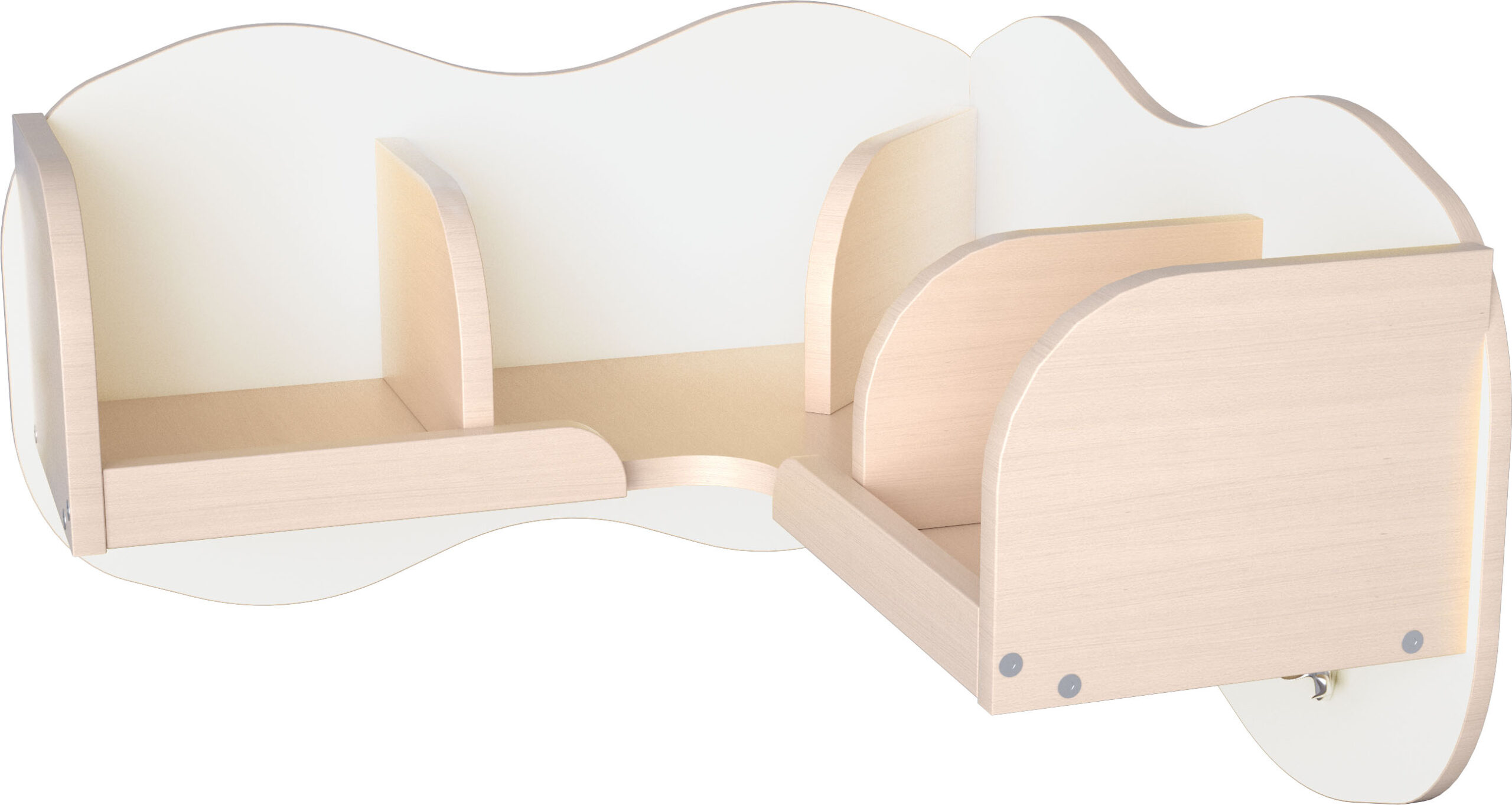 Kampinė lentyna su skyriais ir kabliukais. Pagaminta iš 18 mm storio laminuotos klevo atspalvio plokštės.