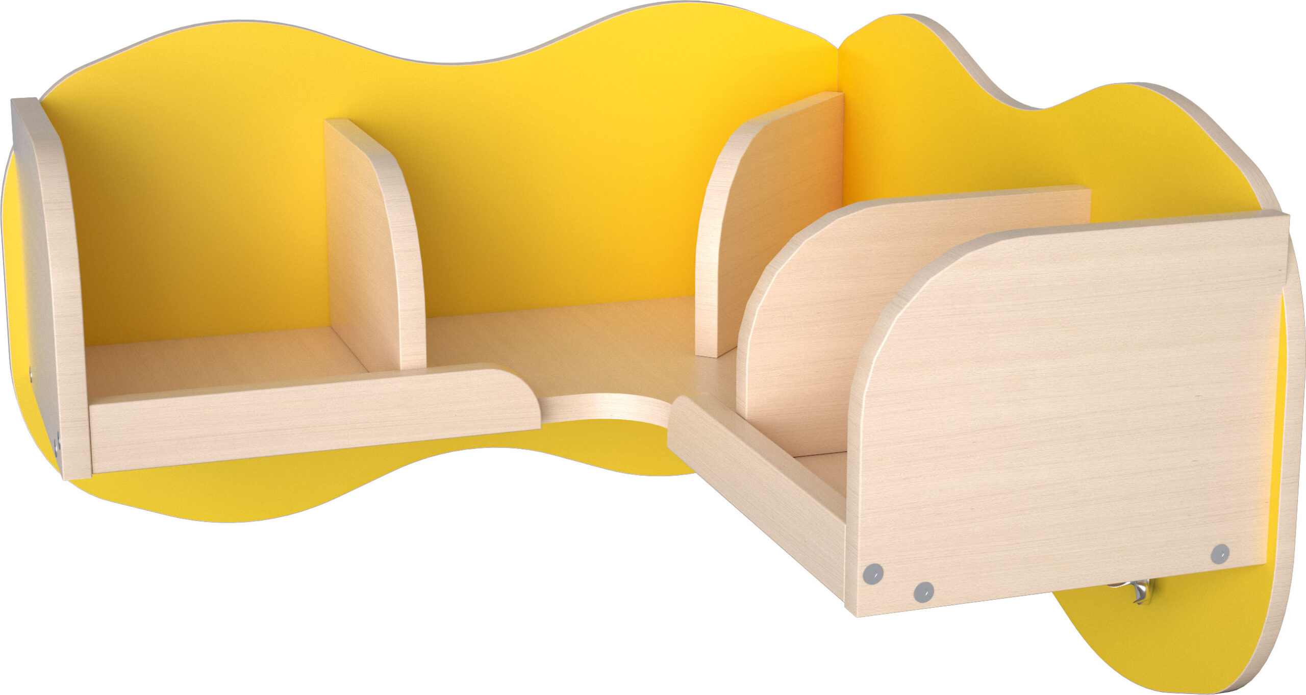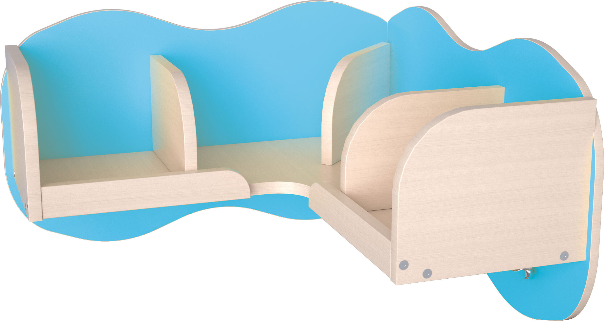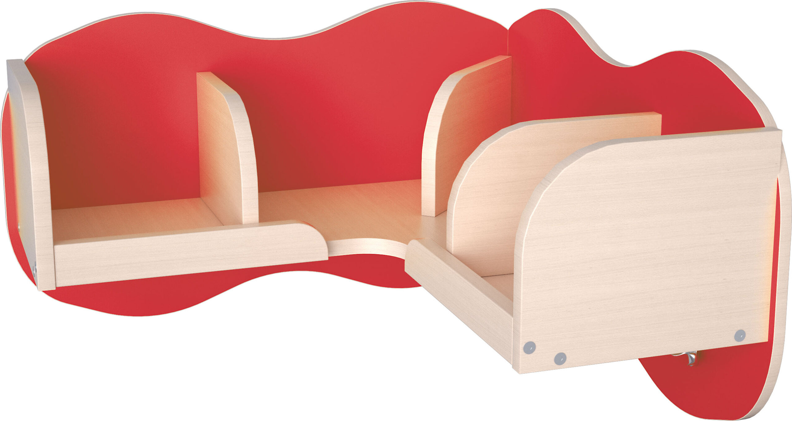 Kampinė lentyna su skyriais ir kabliukais. Pagaminta iš 18 mm storio laminuotos klevo atspalvio plokštės.