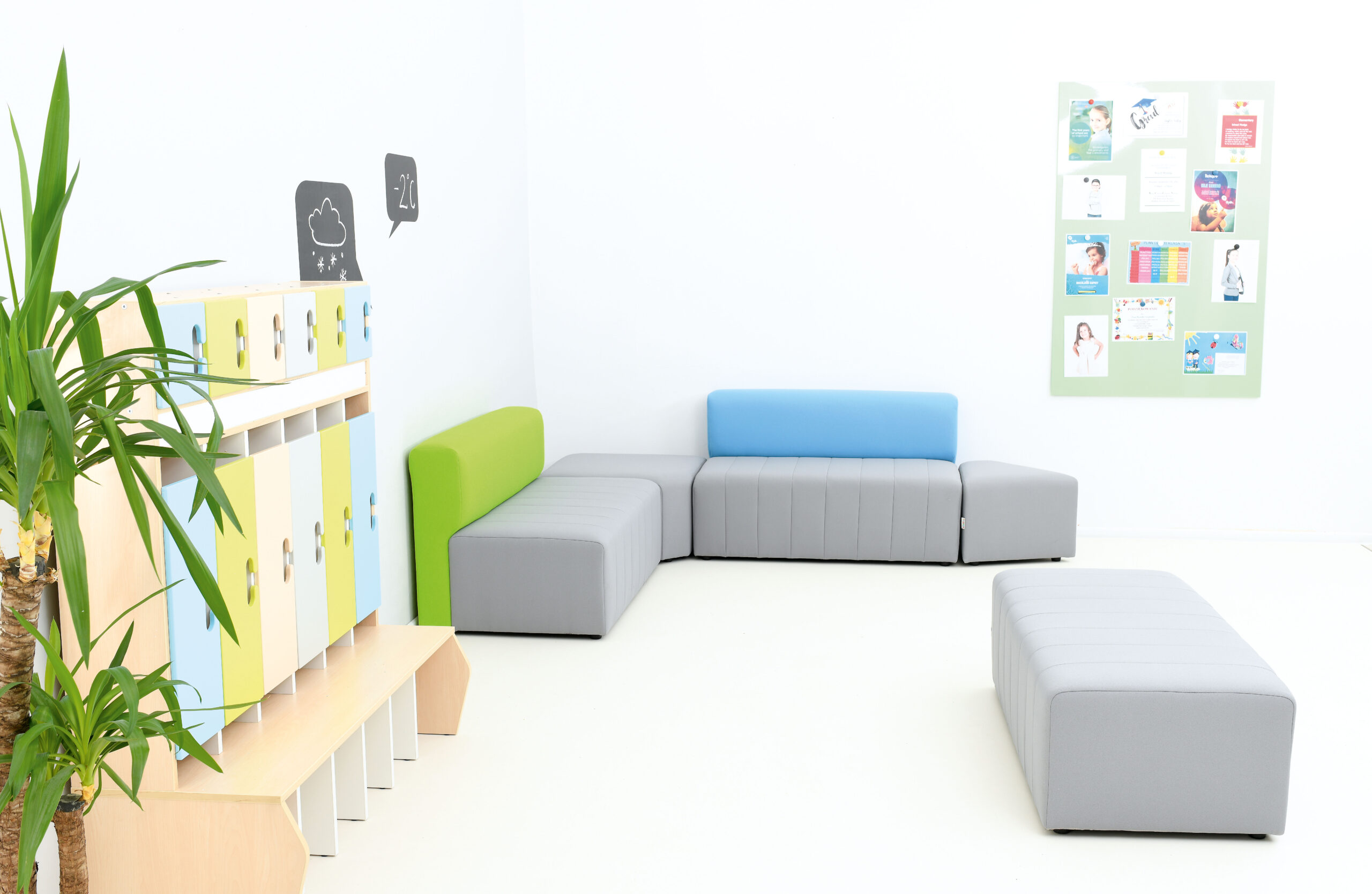 Sėdimosios dalys pagamintos iš putplasčio ant medinio karkaso. Aptrauktos nedegiu audiniu, kuris užtikrina saugumą, patvarumą ir lengvą priežiūrą. Puikiai tinka naudoti mokyklose, vaikų kampeliuose ar kitose viešose erdvėse.