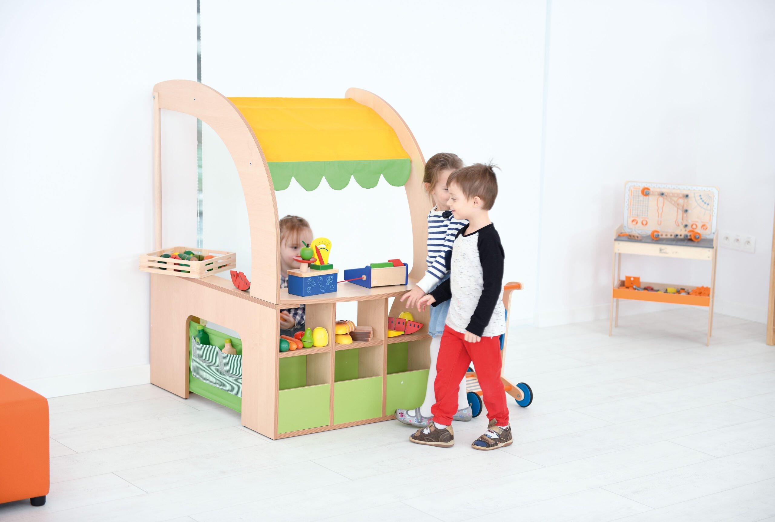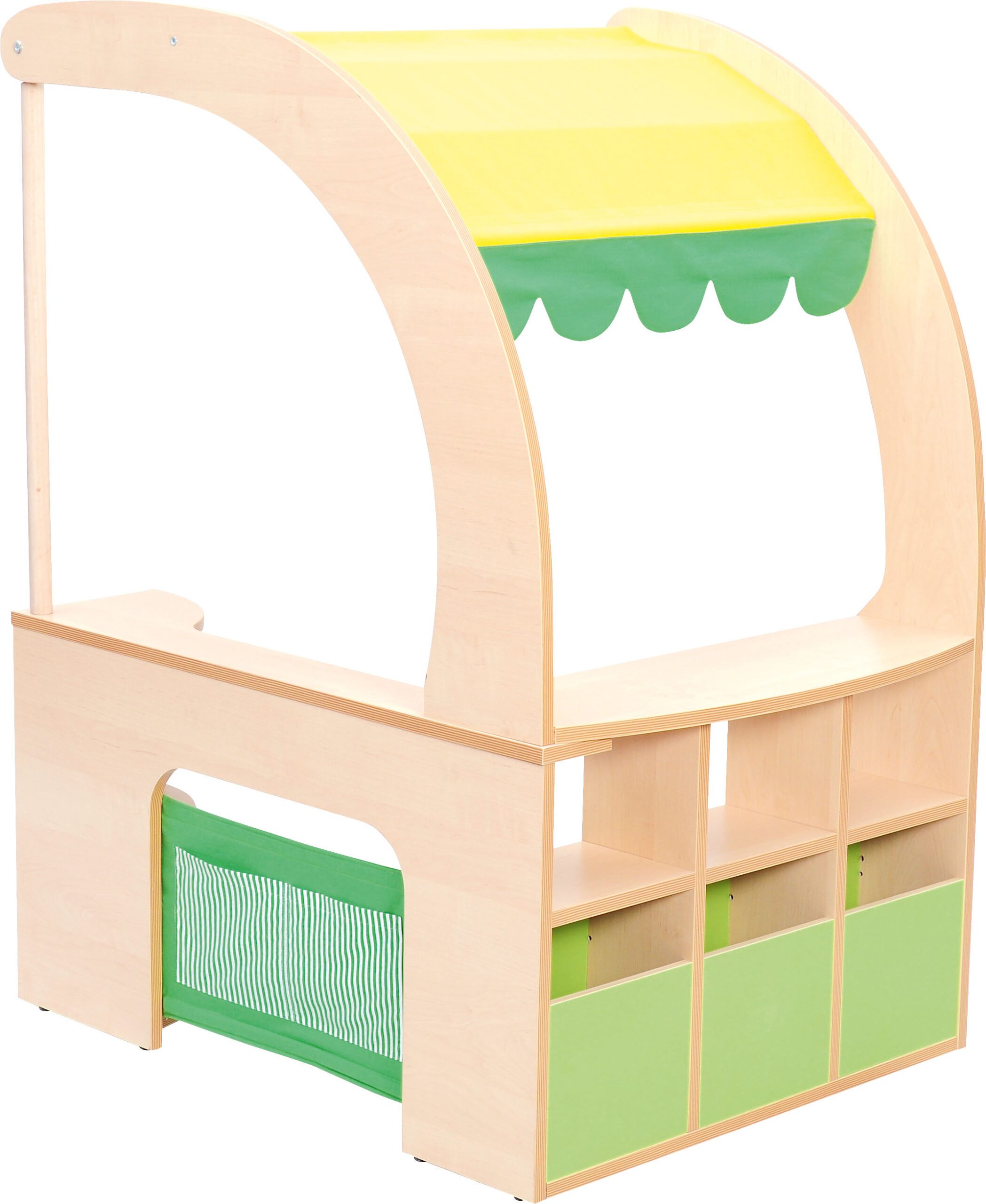 Stendas su daugybe lentynų, stogeliu ir prekystaliu, kuriame įrengtos medžiaginės kišenės, yra fantastiška vieta žaisti, pvz., parduotuvėje. Pagaminta iš 18 mm laminuotos beržo plokštės.