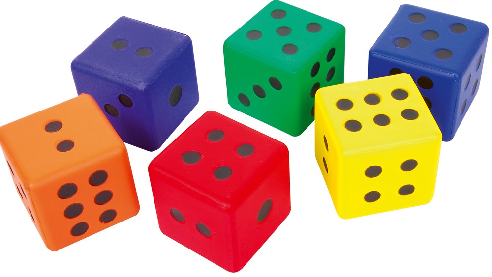 6 įvairių spalvų 7,5 x 7,5 x 7,5 x 7,5 cm dydžio kauliukai