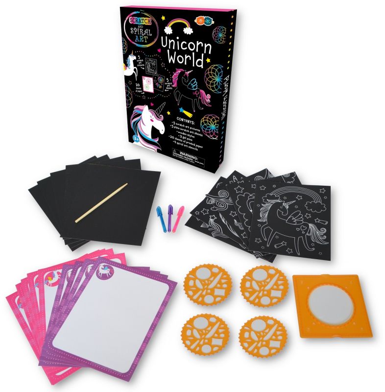 Šiame rinkinyje yra 10 įbrėžimų lapelių – naudokite medinį rašiklį, kad atskleistumėte spalvotus paveikslėlius, o tada sukurkite savo nuostabius spiralinio meno kūrinius. Taip pat yra 20 lapų spausdinto popieriaus ir 3 geliniai rašikliai, kad galėtumėte sukurti dar daugiau stulbinančių spiralinio meno paveikslėlių!