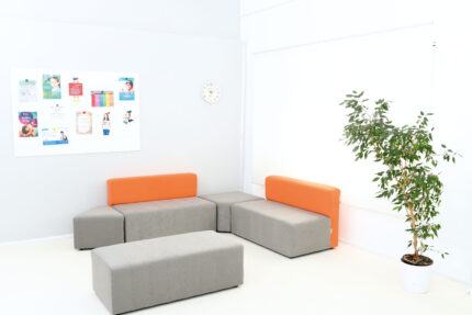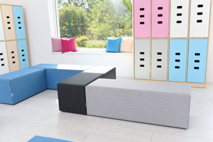 Sėdimosios dalys pagamintos iš putplasčio ant medinio karkaso. Aptrauktos nedegiu audiniu, kuris yra saugus, patvarus ir lengvai prižiūrimas. Puikiai tinka poilsio zonoms, ugdymo įstaigoms ar viešosioms erdvėms.