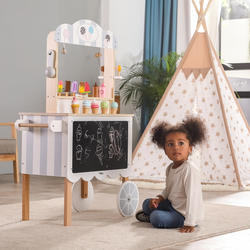 3 viename: parduotuvė, ledainė ir kepyklėlė: rinkinyje daug priedų: ledai, vafliai, glaistai, saldainiai, taip pat lentelė rašymui ir lentynėlė daiktams. Skatina kūrybiškumą, vaizduotę ir bendravimą.