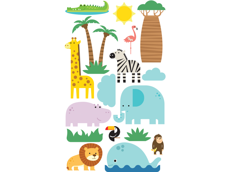 Pastelinių spalvų lipdukai, skirti sienoms ir baldams dekoruoti, vaizduojantys gyvūnus ir gamtą. Jie lengvai nulupami nuo lapo, kad lipdukai nebūtų pažeisti klijuojant. Nulupkite lipduką nuo plėvelės ir atsargiai užklijuokite ant švaraus ir sauso paviršiaus, kad po lipduku neliktų oro burbuliukų. Skirta naudoti vieną kartą, nedegi.