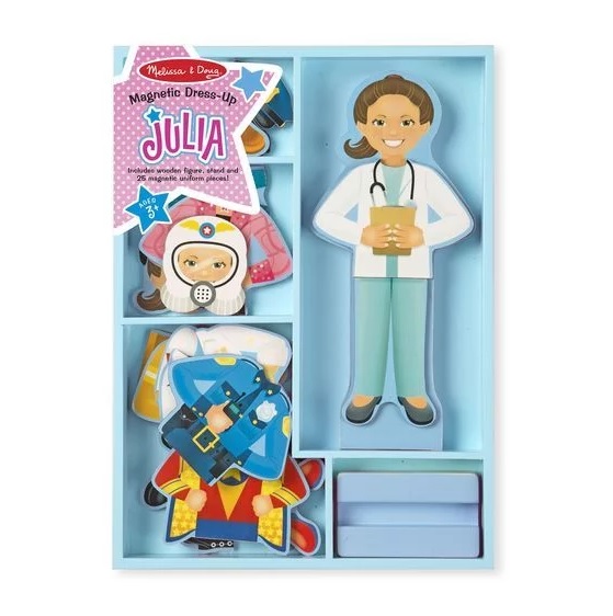 Rinkinį sudaro magnetinė medinė persirengimo figūrėlė su mediniu stovu ir 24 magnetinės drabužių detalės, iš kurių galima sukurti aštuonias profesines uniformas ir aprangą. Lėlė, stovas ir detalės sudėti į tvirtą medinį dėklą. Ši unikali persirengimo lėlė padeda vaikams lavinti rankų ir akių koordinaciją, smulkiąją motoriką, skaičiavimo ir rūšiavimo įgūdžius, skatina kūrybinę raišką ir vaizduotę.