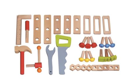 – Komplekte yra įrankių laikiklis ir žaisliniai įrankiai: plaktukas, pjūklas, veržliaraktis, kampainis, medinis pratybų kaladėlė, elektrinis atsuktuvas, grąžtas ir antgalių rinkinys.