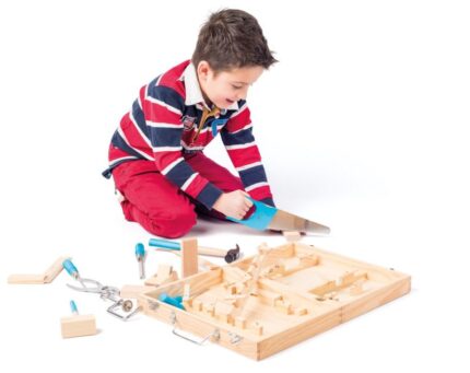 – Komplekte yra įrankių laikiklis ir žaisliniai įrankiai: plaktukas, pjūklas, veržliaraktis, kampainis, medinis pratybų kaladėlė, elektrinis atsuktuvas, grąžtas ir antgalių rinkinys.