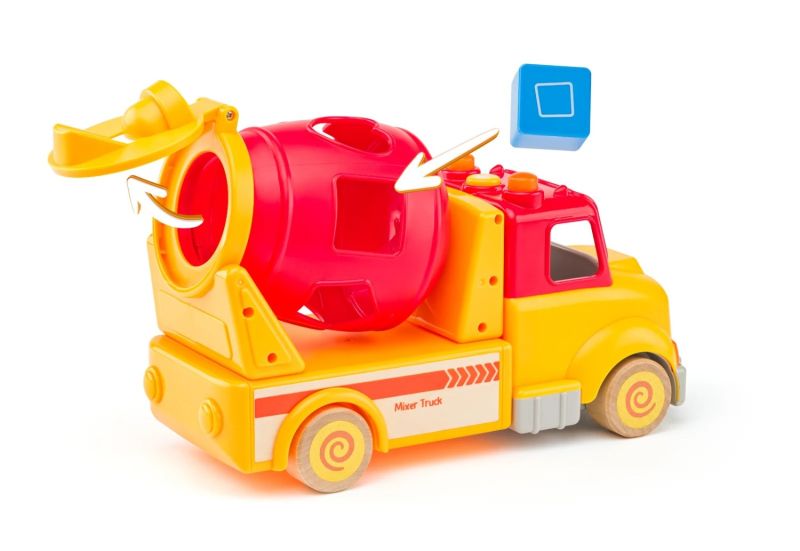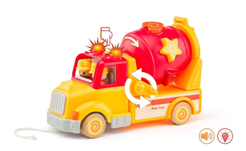 Automobilis pagamintas iš aukštos kokybės plastiko ir medžio, jame yra geometrinės ir žmonių figūrėles. Paspaudus ant kabinos esantį mygtuką, įjungiama šviesa ir garsas.