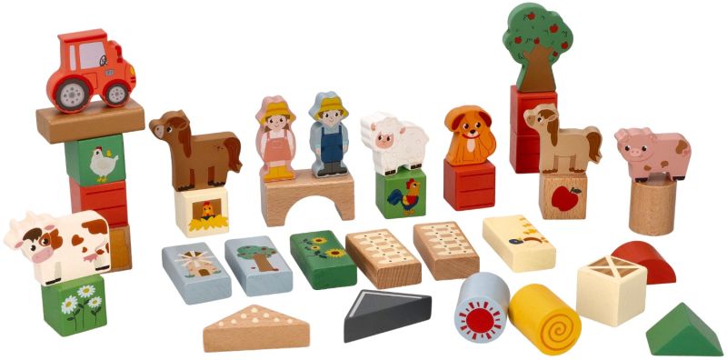 Medinių kaladėlių rinkinyje esantys gyvūnai, ūkininkai, traktorius ir įvairių formų kaladėlės leidžia sukurti spalvingą ūkio pasaulį! Puikiai tinka rūšiavimui, statymui ir vaizduotės lavinimui.