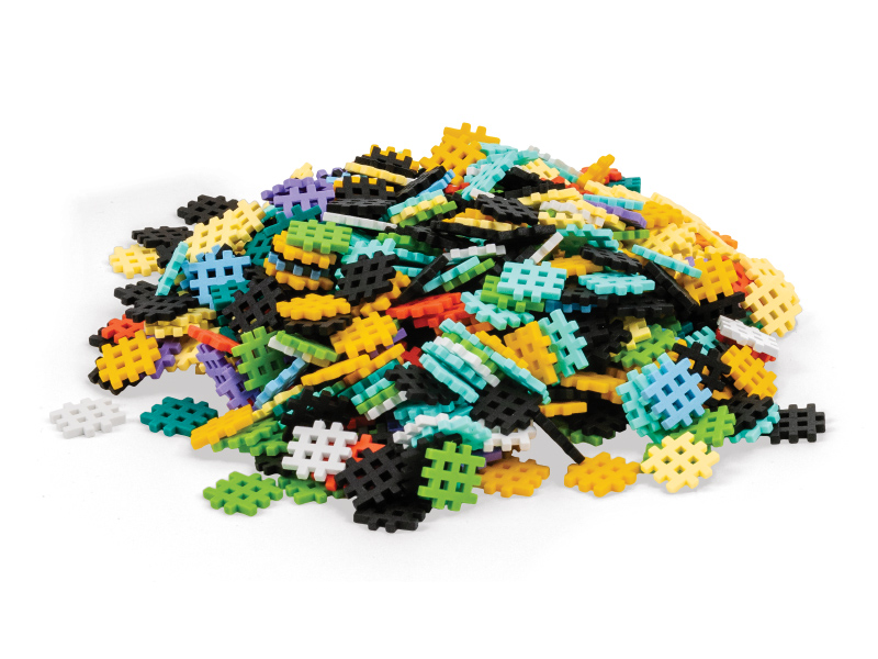 500 vnt. 1 detalės dydis 3,5 x 3,5 x 0,5 cm. Unikali forma leidžia jungti detales visomis 6 kryptimis. Pagaminta iš lankstaus, malonaus laikyti rankoje plastiko, primenančio gumą.