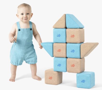 Minkšti tekstiliniai blokeliai mažiems kūdikiams su veidrodėliu, kramtukais, barškučiais ir triukšmingu popieriumi.