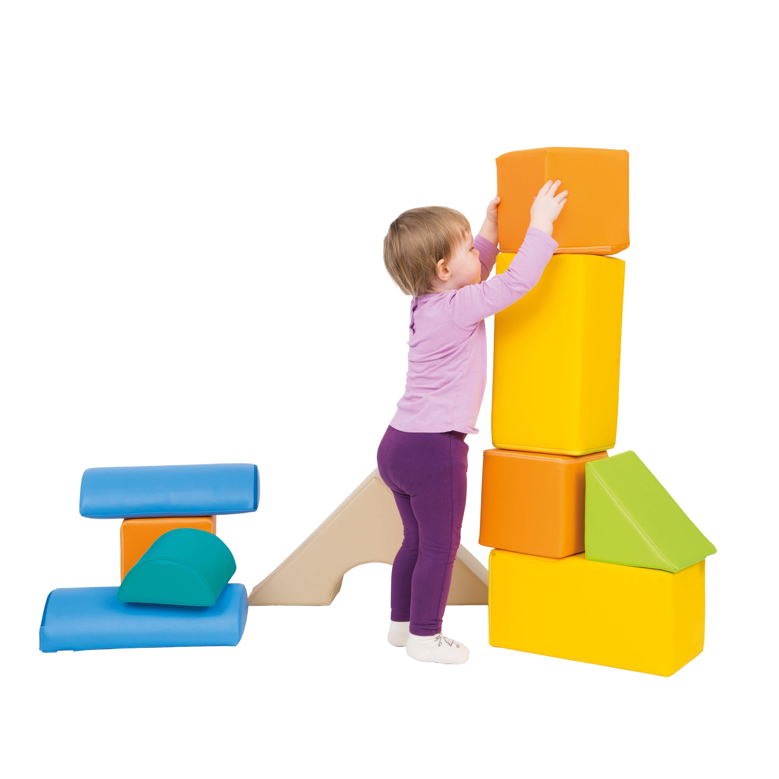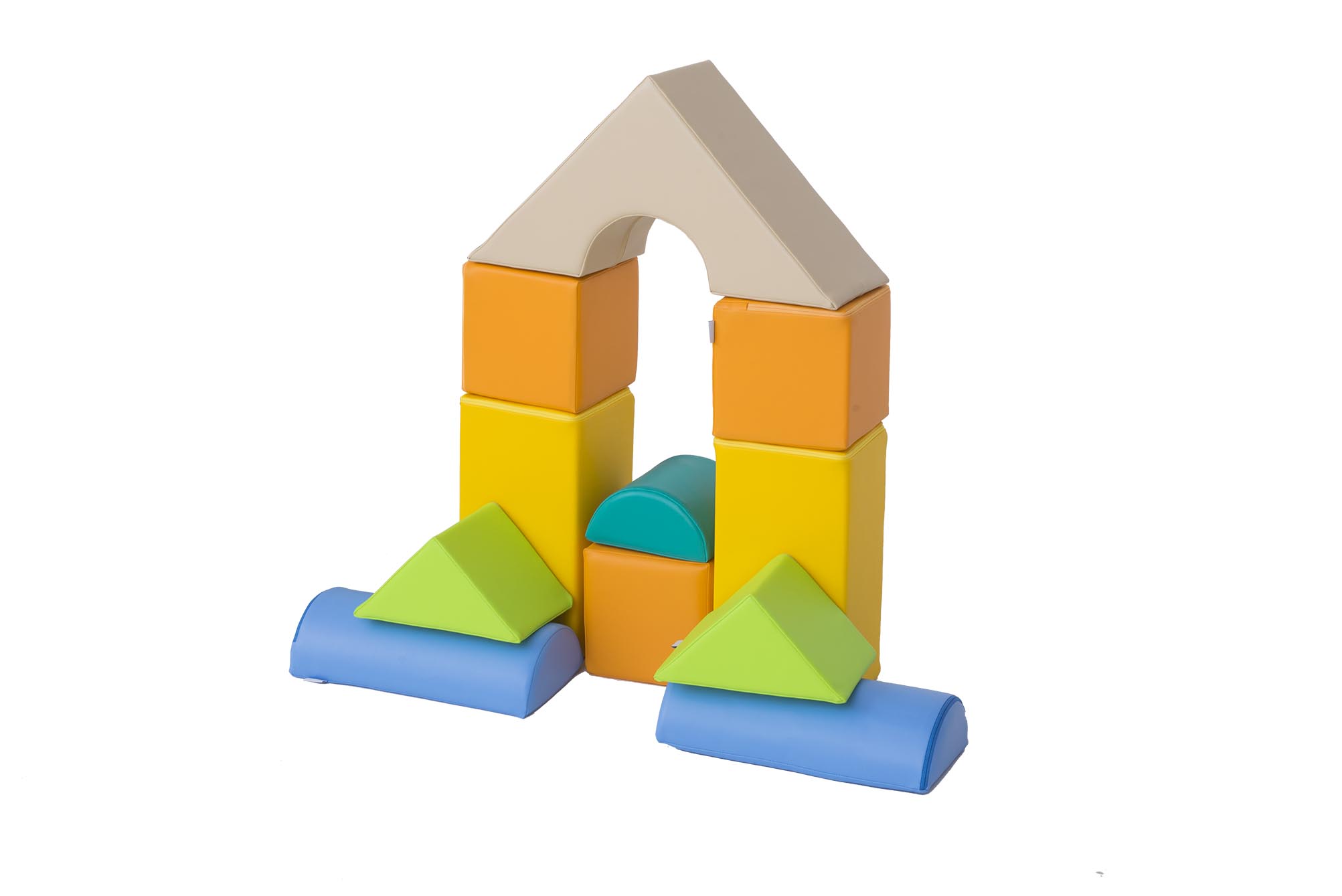 Jie pagaminti iš patvaraus putplasčio, o jų dangteliai pagaminti iš patvaraus putplasčio, o jų dangteliai yra be ftalatų ir lengvai prižiūrimi. Rinkinį sudaro kubo, kuboido, trikampio, puslankio ir kupolo formos kaladėlės.