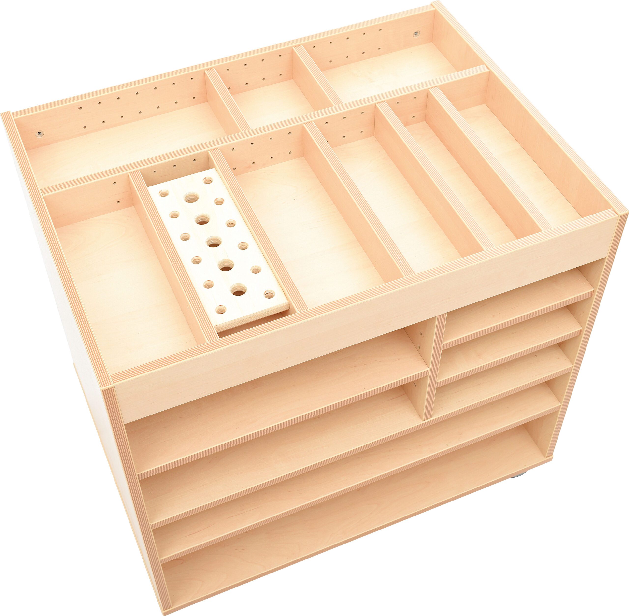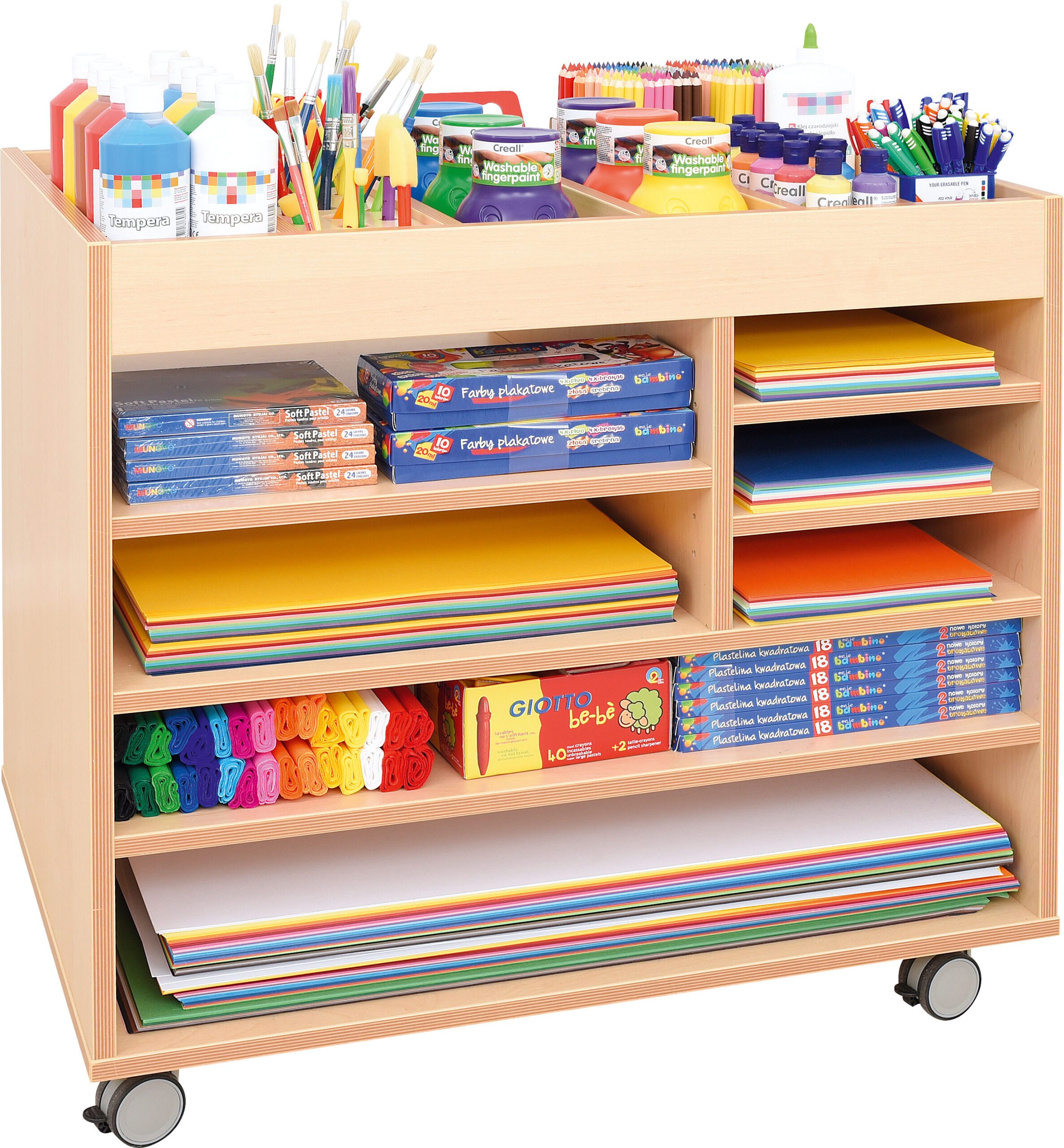 Mobilioji dailės spintelė su daugybe skyrelių, iš keturių ratukų du turi stabdžius. Dvi apatinės lentynos pritaikytos A2 formato ir mažesniems popieriams laikyti (matmenys: 75,8 x 60 cm; aukštis: 15,8 cm ir 9,6 cm). Dvi reguliuojamo aukščio lentynos (46,5 x 60 x 12,5 cm). Dešinėje – erdvė padalinta pertvara: priekyje 3 skyreliai (27 x 35,2 x 7,5 cm), gale – 2 skyreliai (27 x 21 x 12,5 cm).