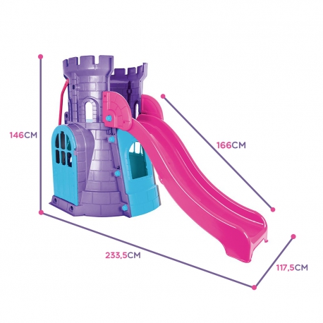 Pilis su čiuožykla – žaidimų namelis ir čiuožykla viename! Bokštas turi šoninį įėjimą, langus ir atviras erdves, taip pat tvirtus laiptus su turėklais. Ilga ir stati 166 cm čiuožykla užtikrins daugybę linksmybių. Puikiai tinka tiek lauke, tiek viduje.