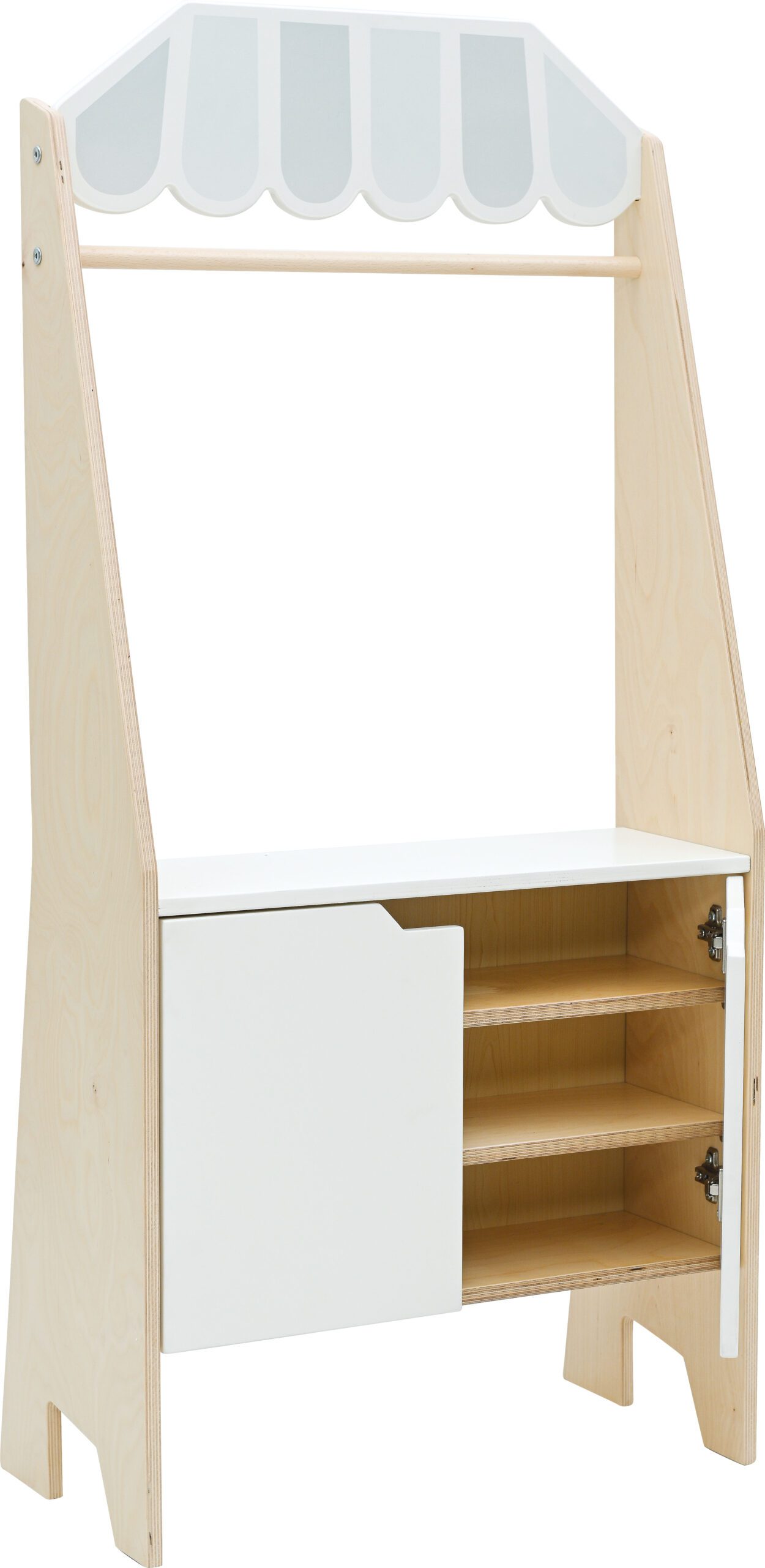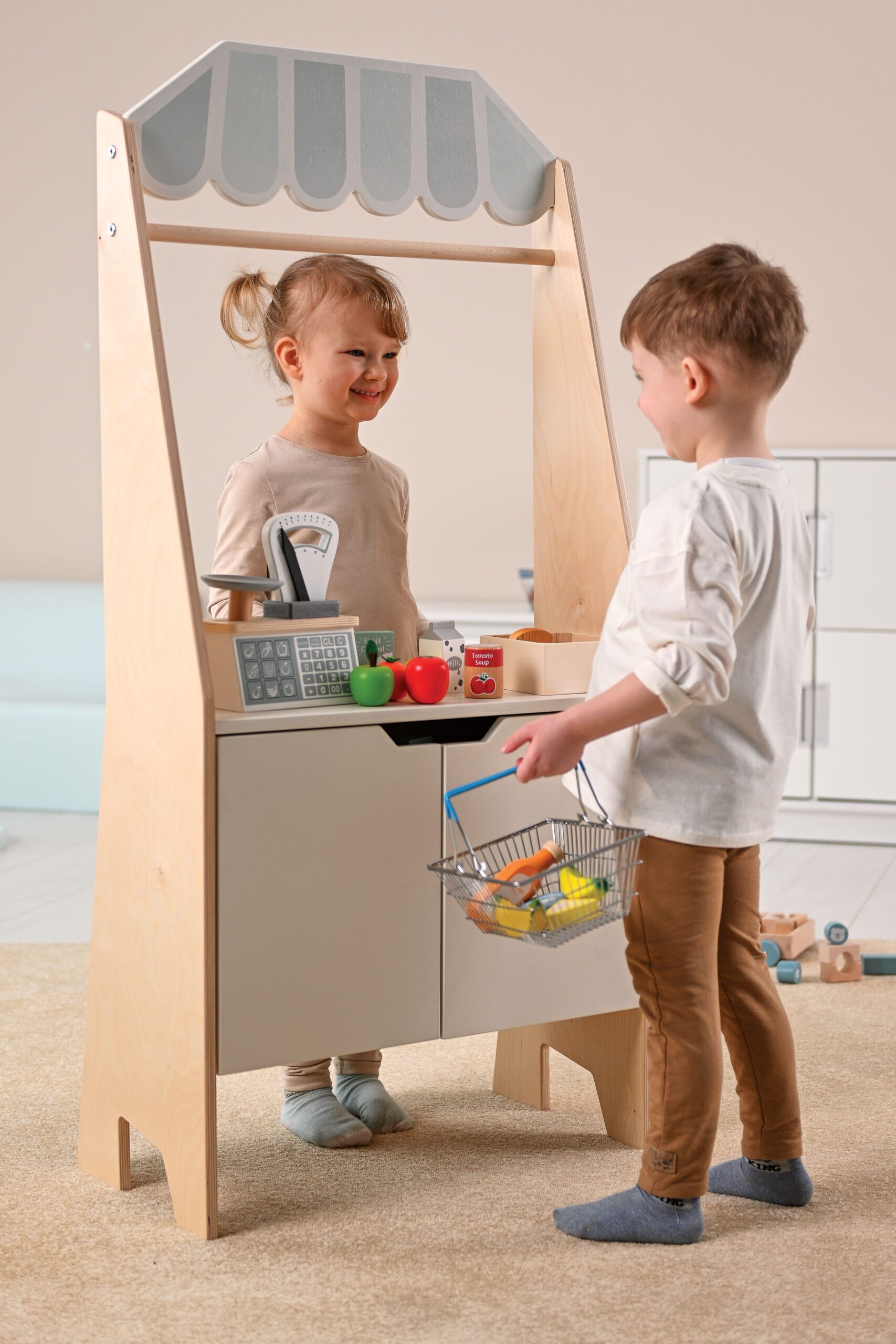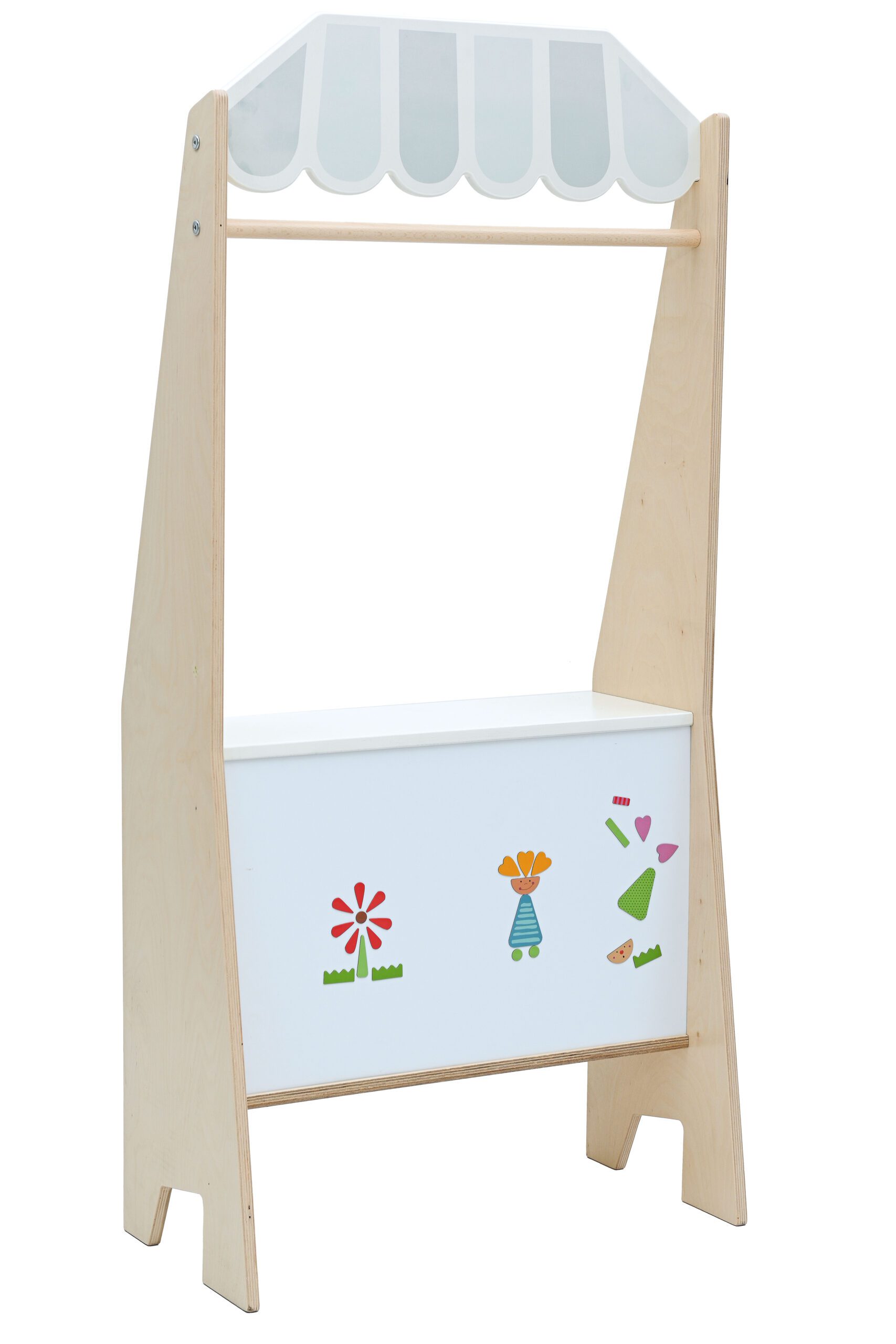 Iš 15 mm storio faneros pagaminta kabina ir teatras viename. Tai puiki vieta žaisti. Jame yra rakinama spintelė ir lentyna. Kitoje pusėje yra balta magnetinė lenta, pagaminta iš HPL. Dėl gaminio universalumo galite žaisti parduotuvėje ir rengti įvairiausius pasirodymus. Daržovių ir vaisių bei vaisių dėžutes reikia įsigyti atskirai.