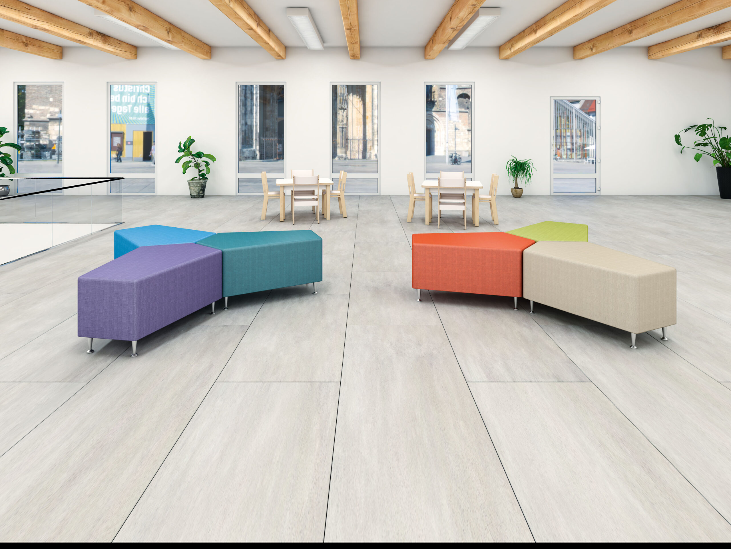 Modernios formos pufas, puikiai tinkantis poilsio zonoms, salėms ar mokyklų koridoriams. Minkštas sėdimosios dalies užpildas – putų konstrukcija ant medinio rėmo. Aptrauktos nedegia gobeleno medžiaga, kuri lengvai valoma ir ilgaamžė.
