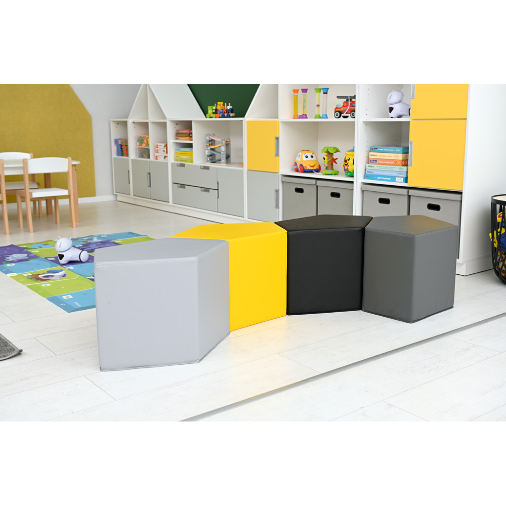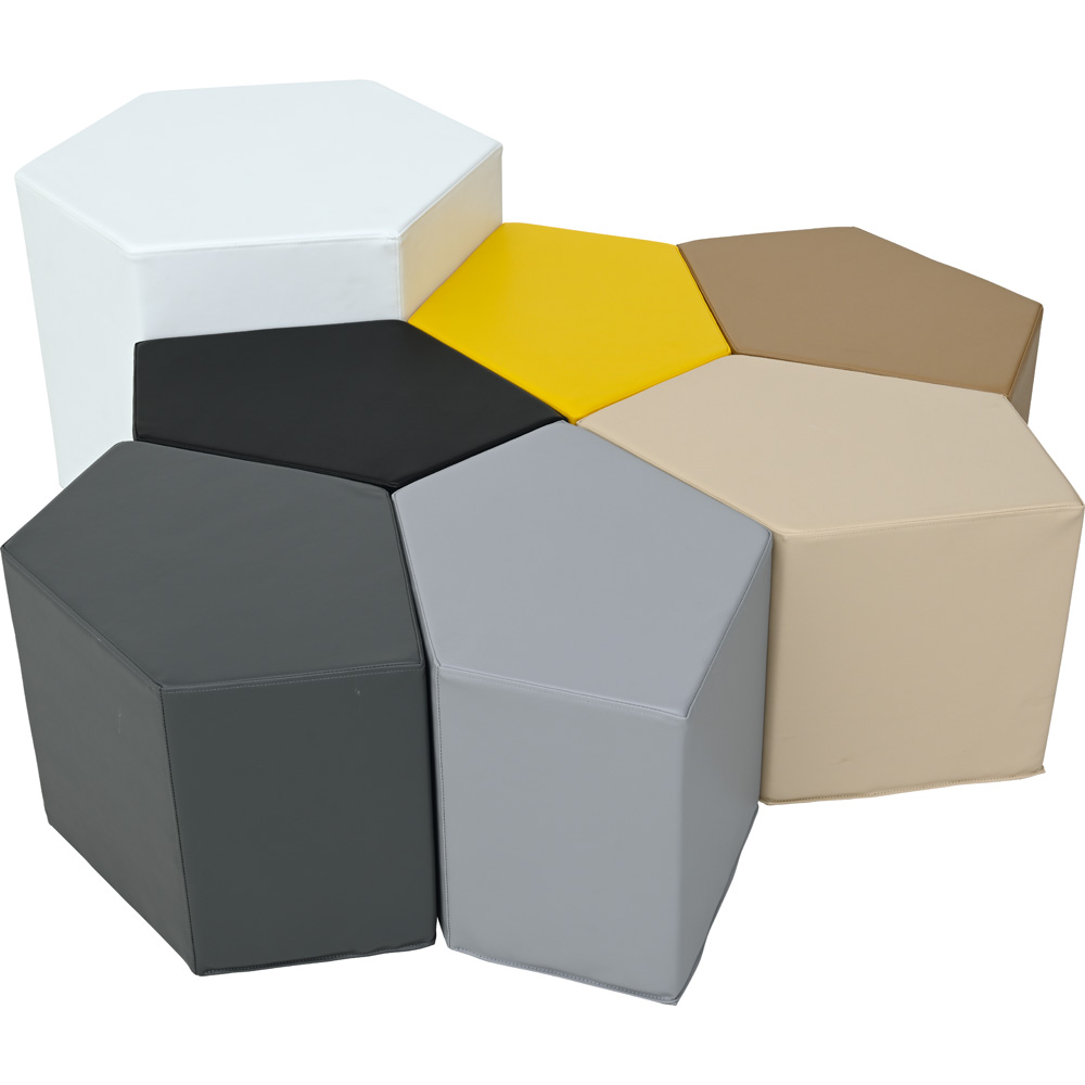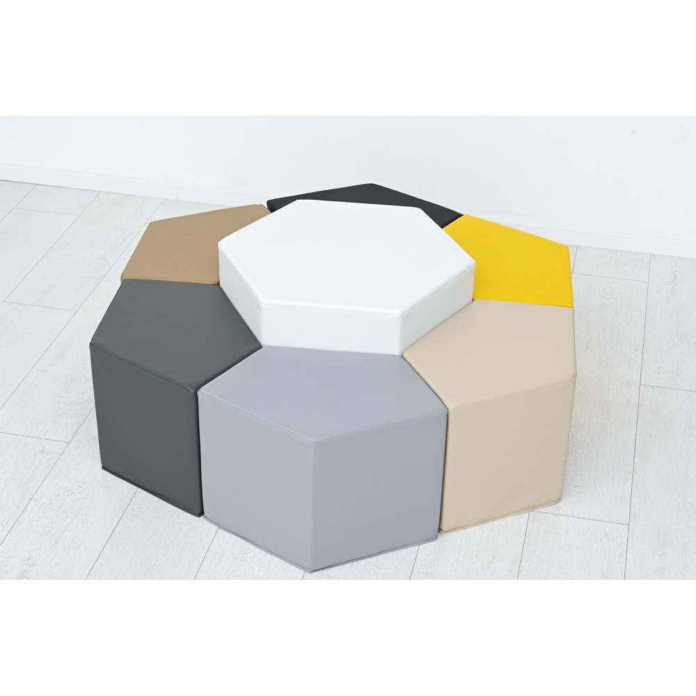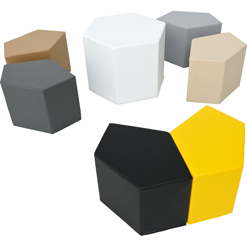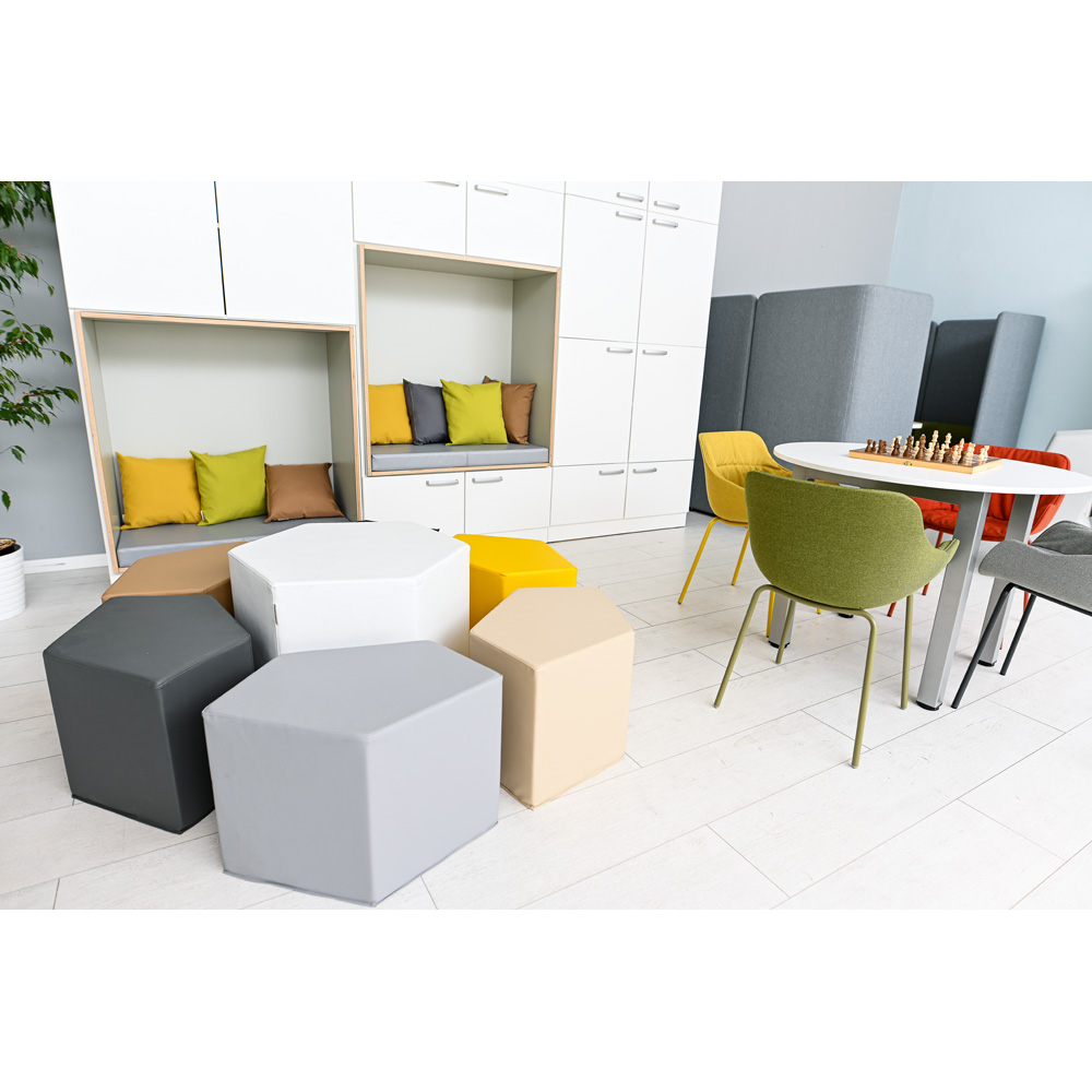 Komplektas, kurį sudaro pufai ir stalas, pagamintas iš putplasčio, padengto skadenu. Sėdynės suprojektuotos taip, kad nenaudojant jų būtų galima atremti į stalą. Dėl nestandartinės formos rinkinio elementai tampa įdomiu dizaino elementu.