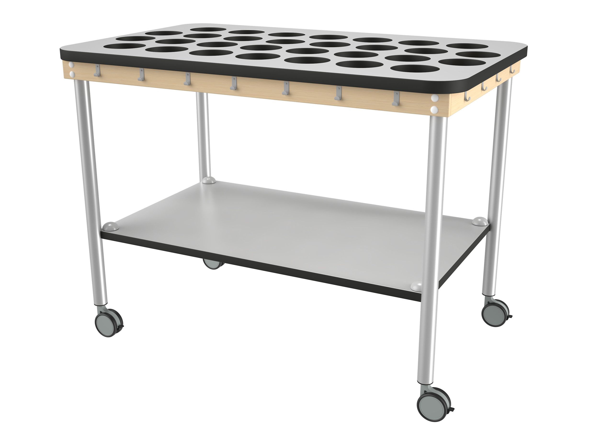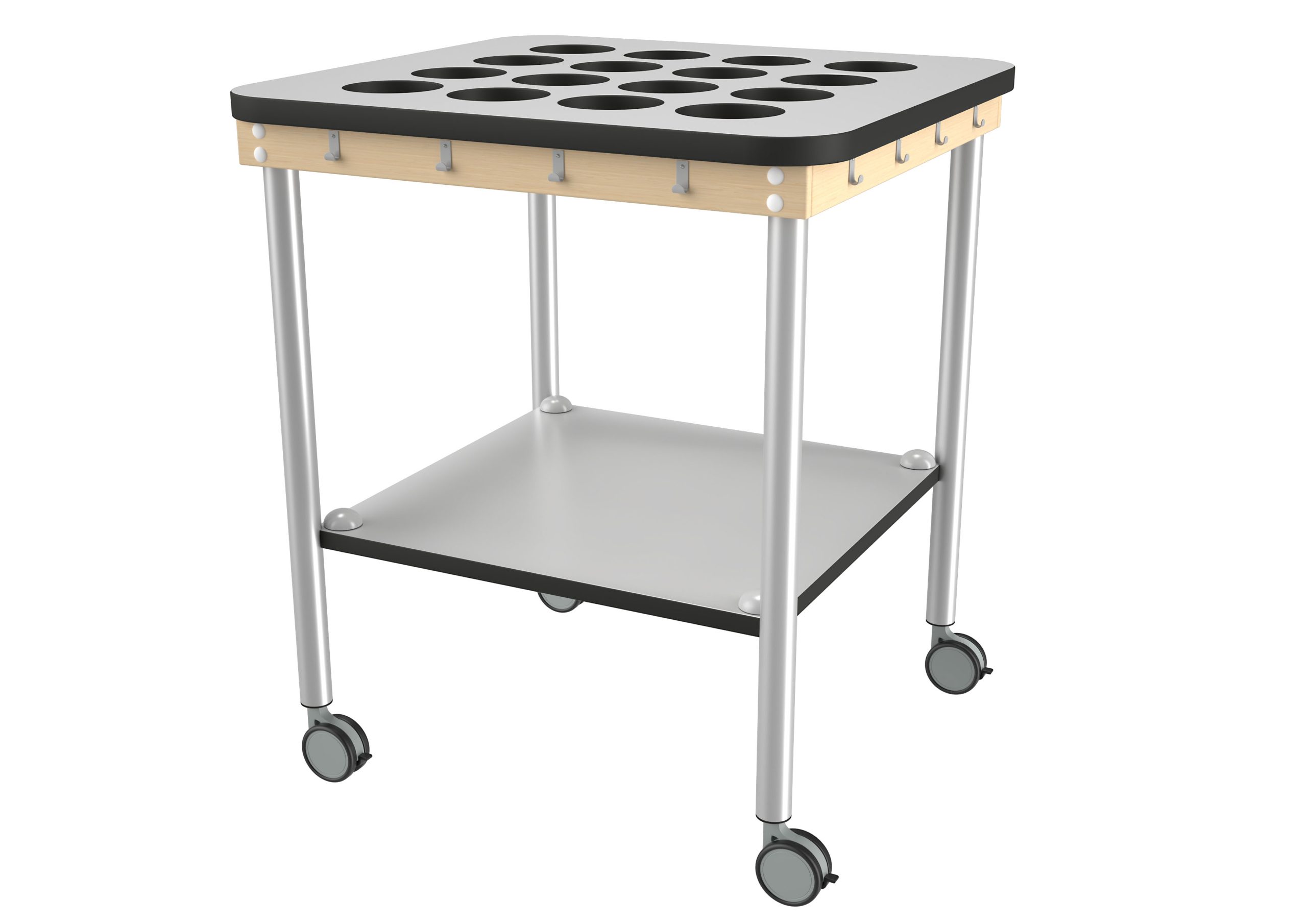 Mobilus staliukas puodeliams ir rankšluosčiams laikyti. Stalviršis ir lentyna pagaminti iš 10 mm HPL laminuotos plokštės, stalo viršus – iš 18 mm lakuotos beržo faneros, o rėmas – iš 32 mm skersmens milteliniu būdu dažyto vamzdžio. Ratukai turi stabdžius.