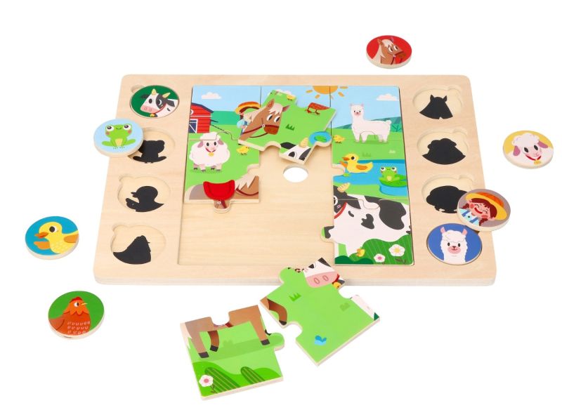 Pradėkite nuo 9 dalių dėlionės, esančios viduryje. Tada suderink 8 medinius žetonus su juos atitinkančiais šešėliais. Galiausiai surask, kur jos yra dėlionėje.