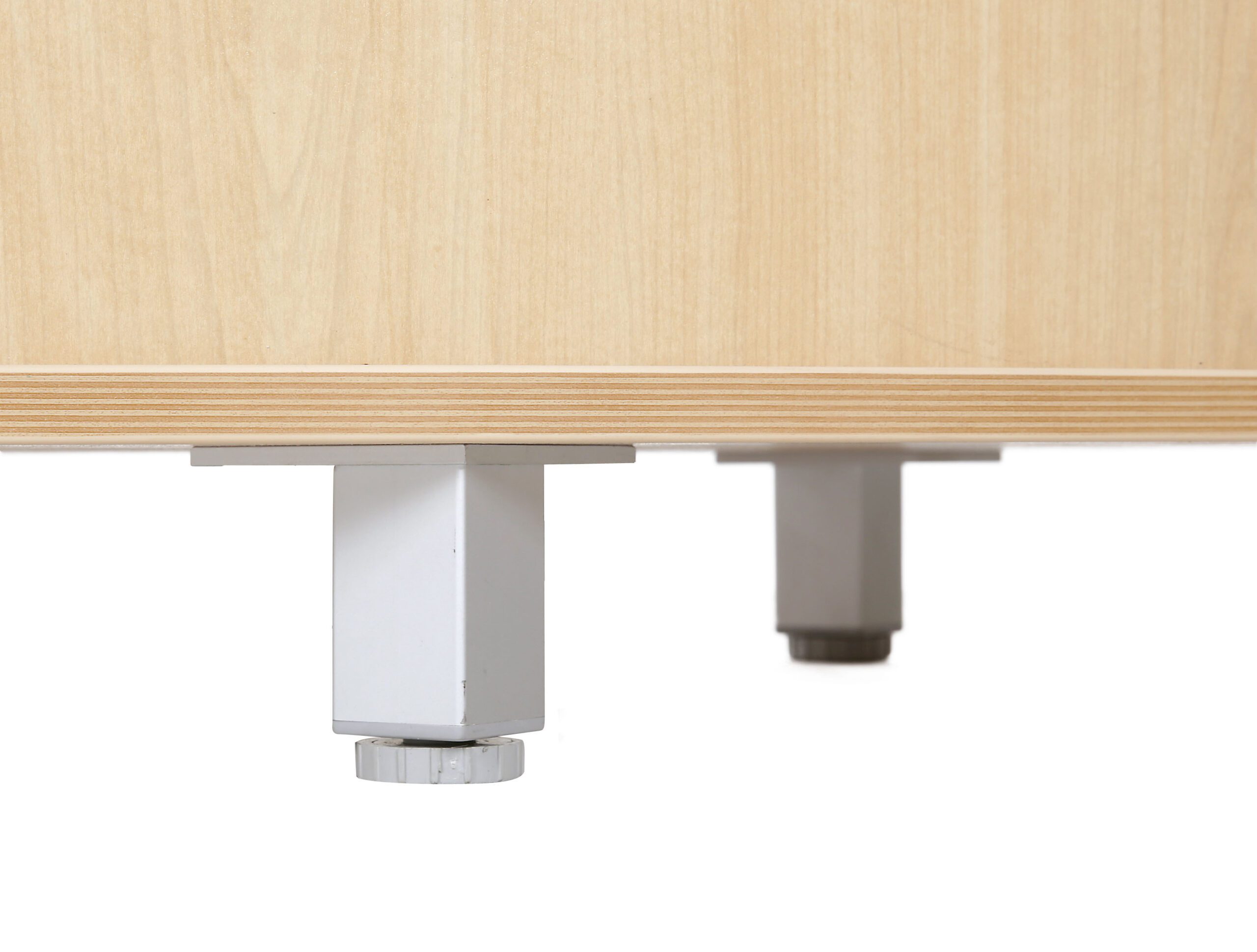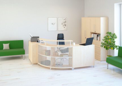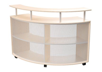 Registratūros stalas, pagamintas iš 18 mm laminuotos beržo medienos plokštės su 2 mm ABS multiplekso briaunomis.