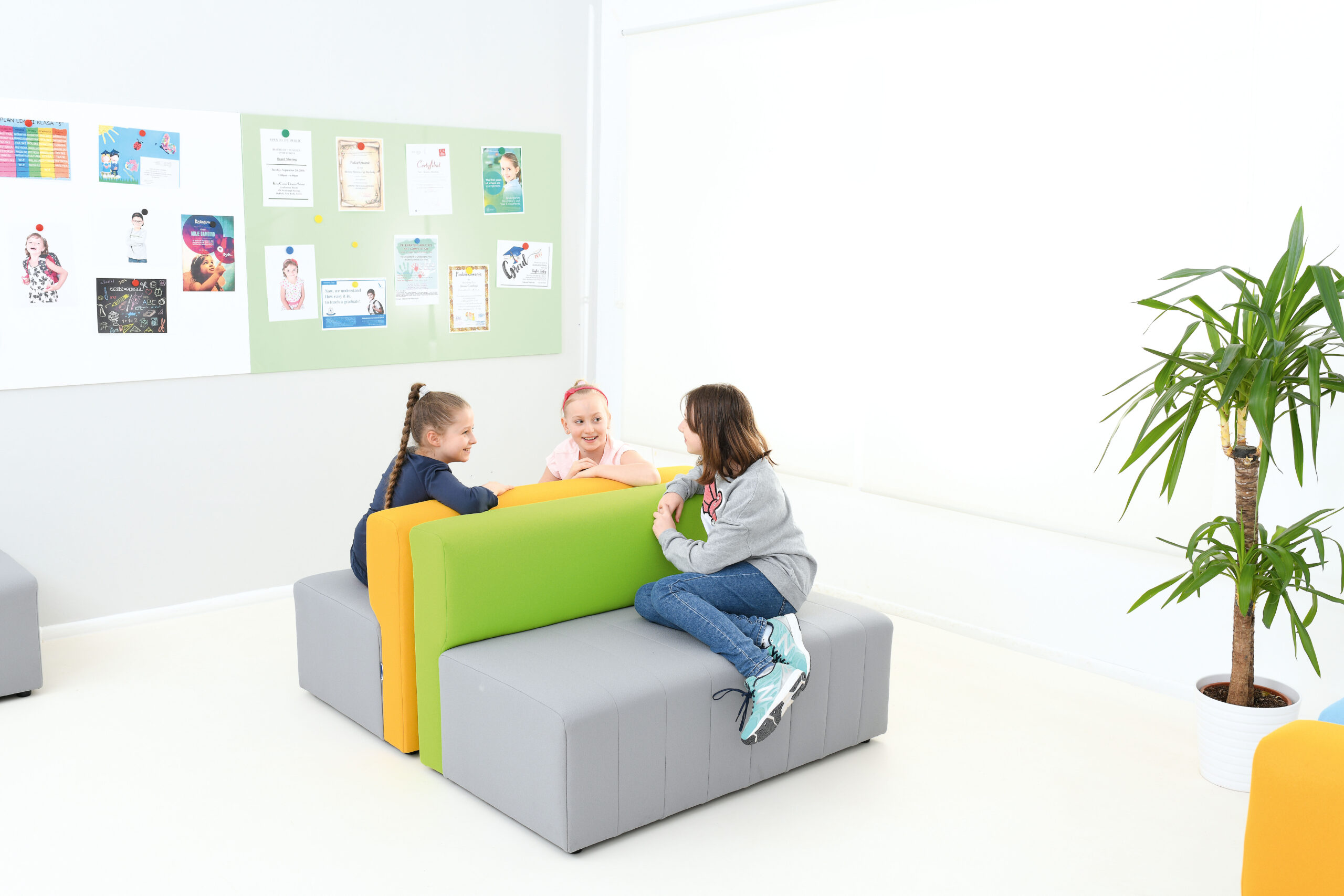 Sėdimosios dalys pagamintos iš putplasčio ant tvirto medinio karkaso. Aptrauktos nedegia audinio danga, kuri yra saugi ir ilgaamžė – puikiai tinka viešosioms ar ugdymo įstaigų erdvėms.