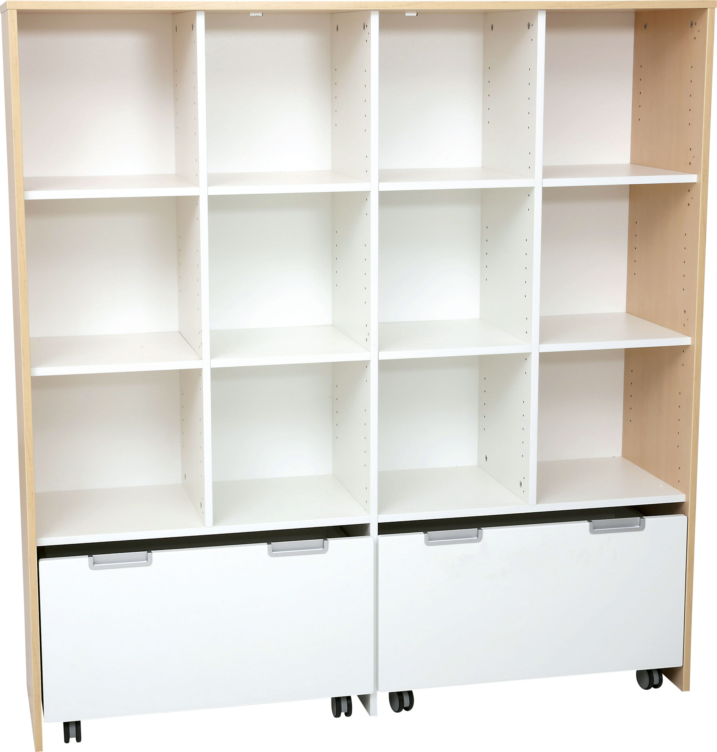 Baldai pagaminti iš baltos arba klevo laminuotos 18 mm storio plokštės, 18 mm storio frontai padengti patvaria termoplastine fanera.