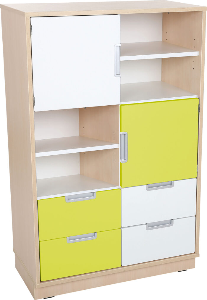 Baldai pagaminti iš 18 mm storio laminuotos baltos arba klevo plokštės, 18 mm storio frontai padengti patvaria termoplastine fanera.