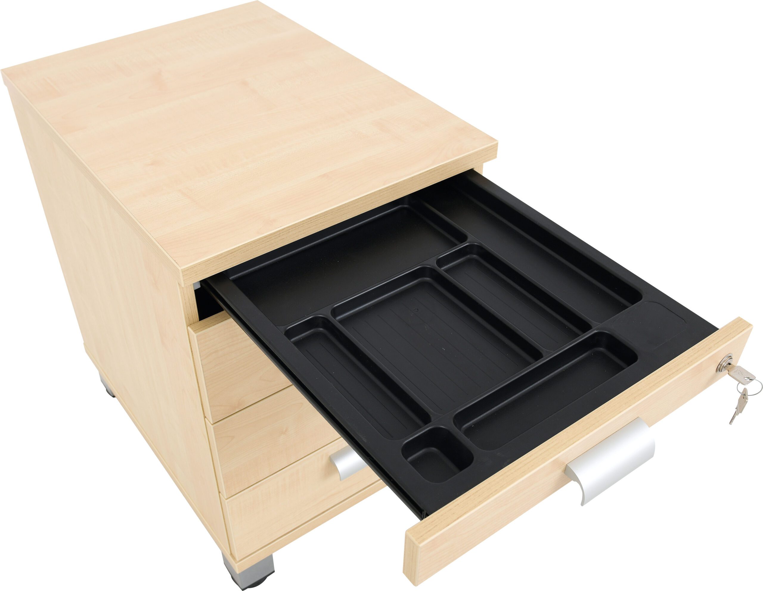 Laisvai pastatomaspintelė, pagaminta iš laminuotos plokštės klevo atspalvio, 18 mm storio ir 25 mm storio plokščių. Įrengta su kojelėmis. Susidaro iš: pieštukinės, dokumentų spintelės, centralizuoto užrakto, stalčių su stabdymo kontrole.
