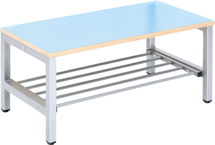 Suoliukai rūbinei ant stabilaus metalinio rėmo, su lentynėle batams. Skyriaus plotis 18 cm. Sėdynė pagaminta iš 19 mm storio faneros, padengta spalvotu HPL laminatu.